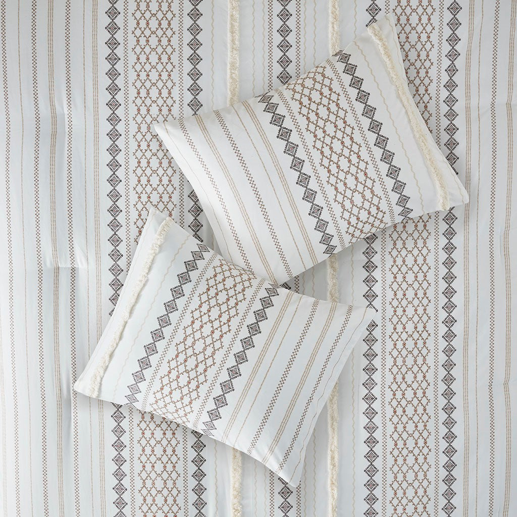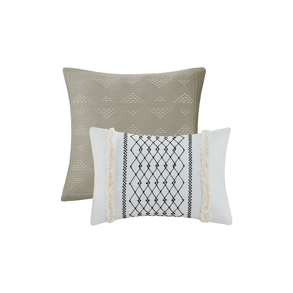 Revitalize your bedroom with the affordable, chic style of the 510 Design Adina 5 Piece Printed Comforter Set. The soft microfiber comforter features an Aztec print with chenille trim that adds dimension to this globally inspired look. Matching shams repeat the pattern of the comforter, while the square and oblong decorative pillows add textured touches to the casual bedding set. Machine washable for easy care, this printed comforter set brings a casual and bright update to your bedroom decor. The microfiber bedding set may come in rolled or compressed packing and will need to be fluffed up. Use a steam iron to help remove wrinkles easier.