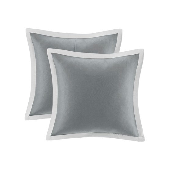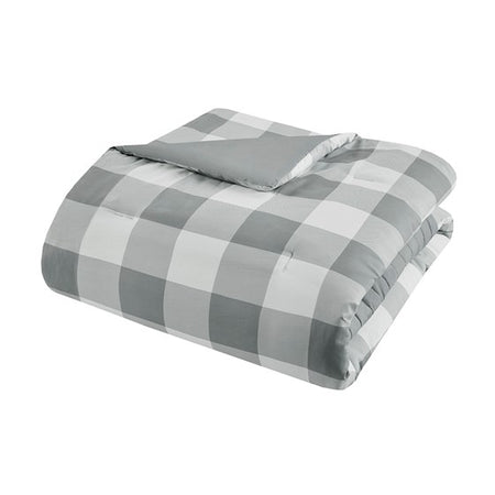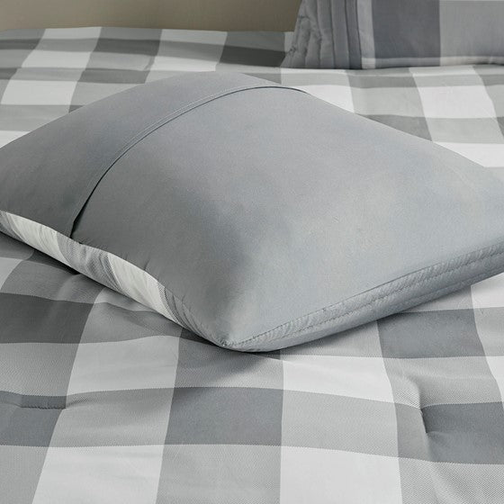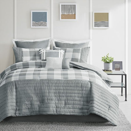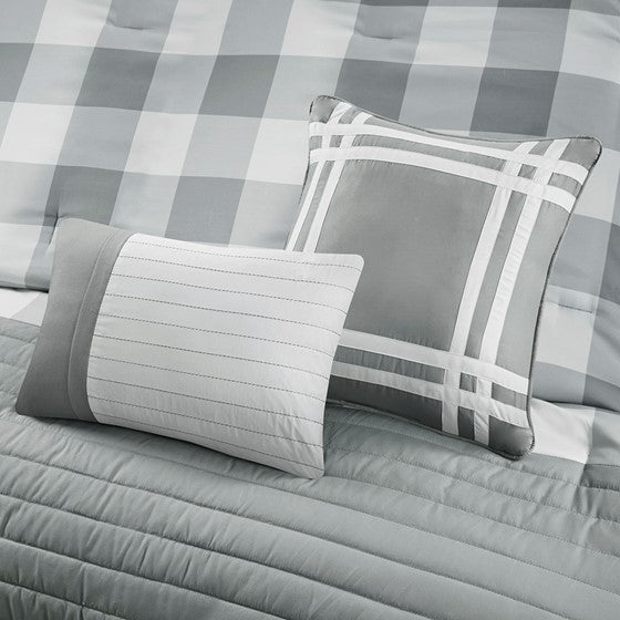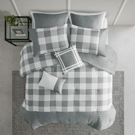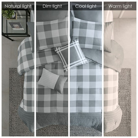 Transitional charm meets modern style in 510 Design's Georgetown 8 Piece Comforter Set. The microfiber comforter features a grey and white plaid design with quilted and pieced details, for a sophisticated casual look that easily coordinates with any bedroom decor. A solid grey reverse complements the plaid pattern on top of the bed. The 2 matching pieced shams and 2 Euro shams pair handsomely with the soft plaid comforter. Also included are 2 decorative pillows and a solid grey bed skirt that provide the finishing touches to the casual bedding set. Hypoallergenic polyester filling in the comforter and decorative pillows provides exceptional warmth and comfort. Machine washable for easy care, this traditional comforter set may come in rolled or compressed packing and will need to be fluffed up. Use a steam iron to help remove wrinkles easier.