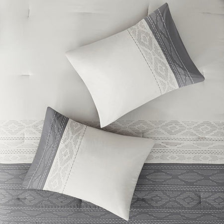 - Transitional 8 piece comforter set in two main tones (grey and oatmeal) with embroidered and pieced details
