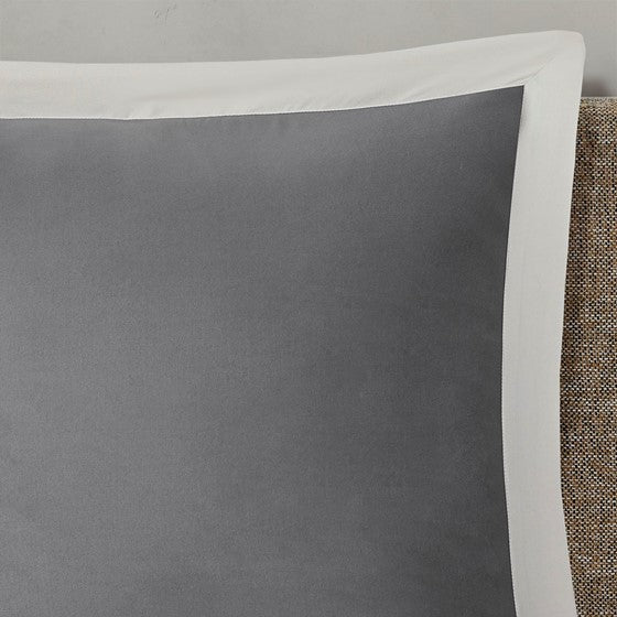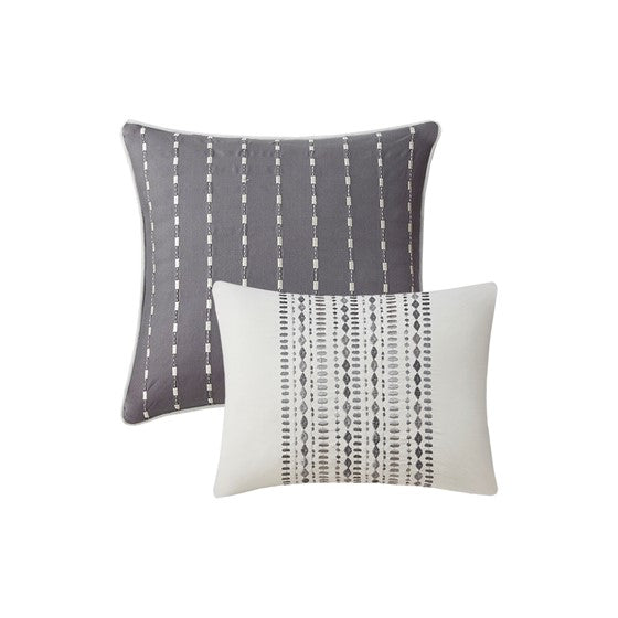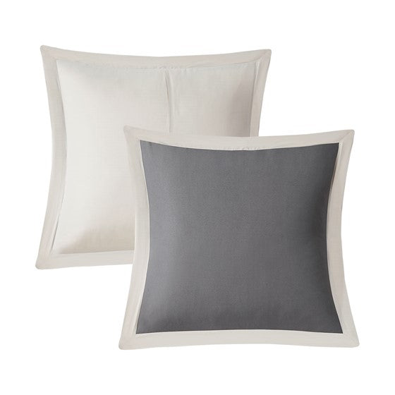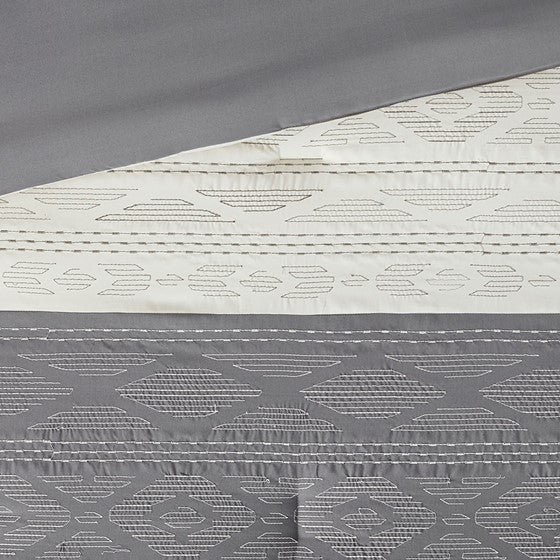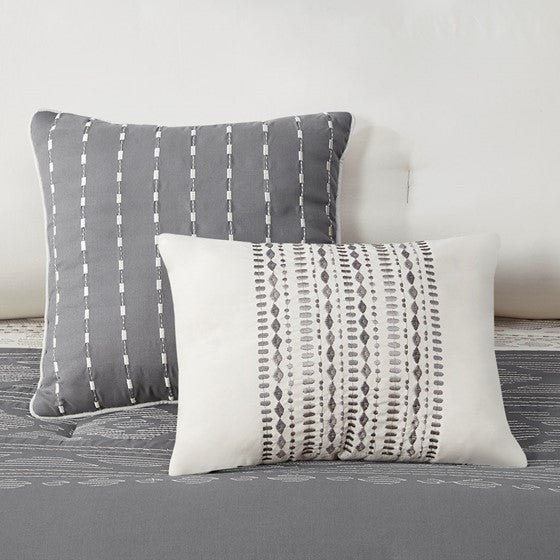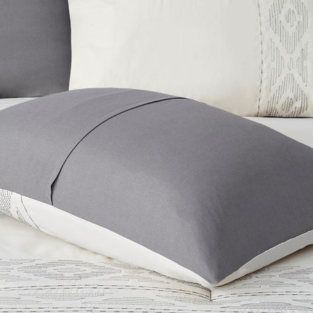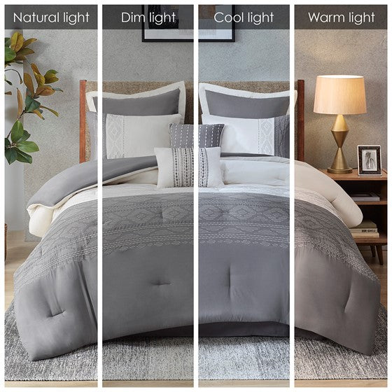 The 510 Design Helena 8 Piece Embroidered Comforter Set offers a simple elegance to refresh your bedroom decor. The two-tone comforter features embroidered and pieced details on a grey and oatmeal tone fabric, for a sophisticated and graceful design. A solid grey reverse complements the top of the two-tone comforter to give you a chic look that combines transitional style with modern colors. The 2 matching shams and 2 Euro shams pair handsomely with the comforter to complete the embroidered comforter set. Also included are 2 decorative pillows with embroidered details that provide the finishing touches. Machine washable for easy care, this soft comforter set may come in rolled or compressed packing and will need to be fluffed up. Use a steam iron to help remove wrinkles easier.