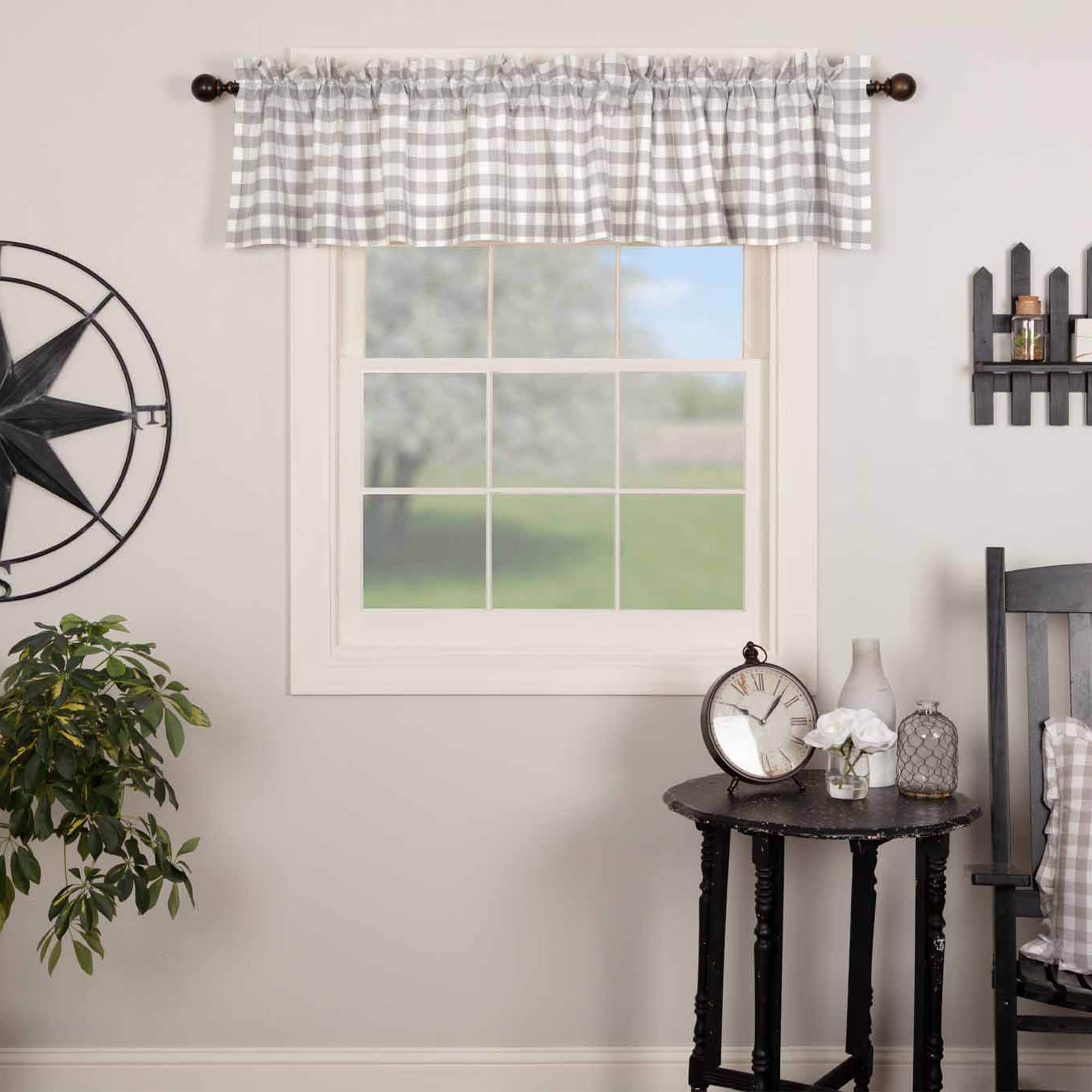 The Annie Buffalo Grey Check Valance is a fresh and lighthearted piece tailored to complete the look of your laid back farmhouse decor. Grey and antique white buffalo checks create a relaxed country feel in your home. Place this 16x90 curtain topper in the kitchen or on any window to enhance the style of a room. This 100% cotton valance has a white lining to keep away the sun's glare and has a rod pocket for simple hanging.