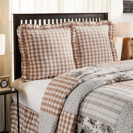 Accent your farmhouse bedroom with classic gingham patterns and soft ruffles for a big helping of country charm. The Annie Buffalo Portabella Check Euro Sham includes one 26x26 euro sham pillow cover. European pillow shams are a great way to add a finishing touch to farmhouse bedding for a perfectly cozy and put-together feel. This cotton pillow sham includes a three inch ruffle and a delightful large-scale buffalo check pattern in light brown and white. The decorative pillow case includes the same fabric on both the front and back with a tie closure to hold your fill pillow (not included) in securely. Machine washable and iron safe.