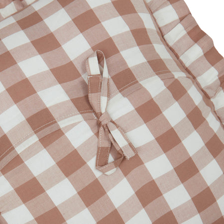 White and portabella brown in buffalo check plaid create a classic look for traditional farmhouse home decor. The Annie Buffalo Portabella Checked Ruffled Fabric Pillow measures 18x18 inches and includes a removable cover with tie-style closures. The removeable cotton pillowcase includes a polyester fill. Ruffled edging adds a soft, elegant finishing detail. Add to an entryway bench or soften a rocking chair with ease. Pair with other pieces from the Annie Buffalo Collection for a complete look or mix with other modern farmhouse decor. Machine washable and iron safe.