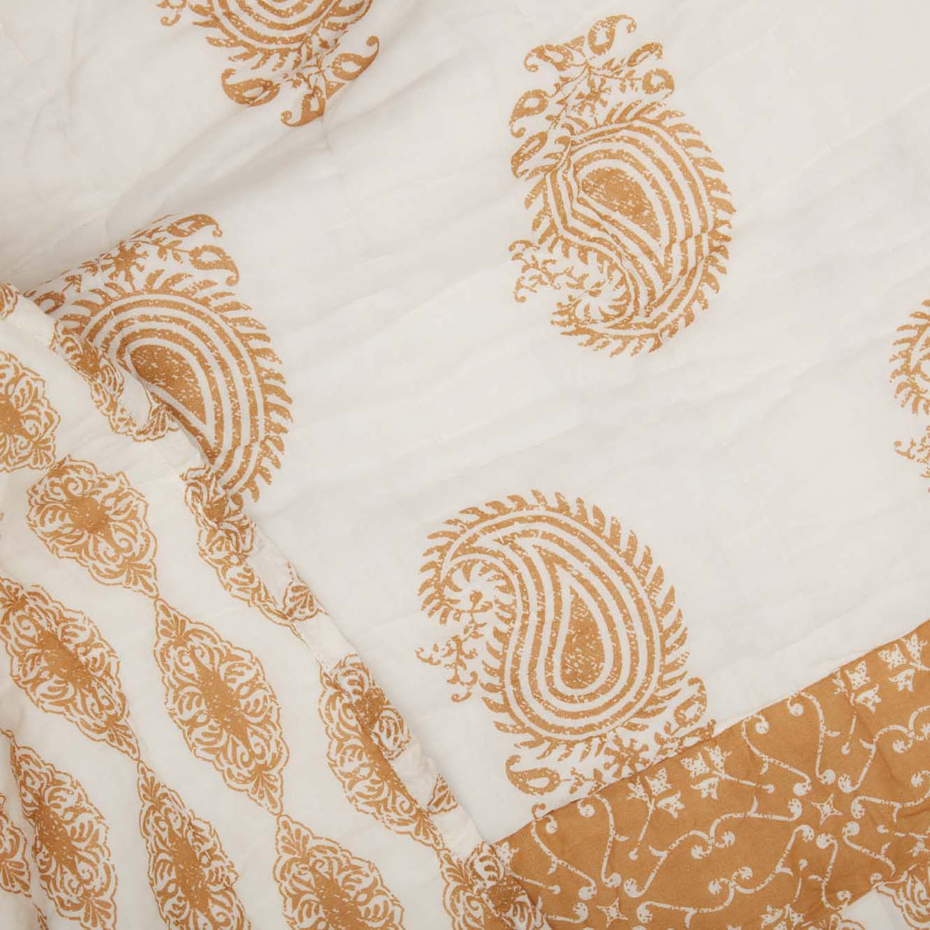 Dress your bed with playful colors and a unique coastal meets country design. Our Avani Gold Twin Quilt measures 68 by 86 inches and features refreshing gold and white tones in a distressed paisley pattern perfectly suited for any bohemian farmhouse bedroom. Machine washable and iron safe, this cozy quilted bedspread is both practical and stylish. Includes a 100 percent cotton shell and cotton batting for extra warmth. For a complete look, pair this quilted blanket with our Avani Gold bed skirt and shams.
