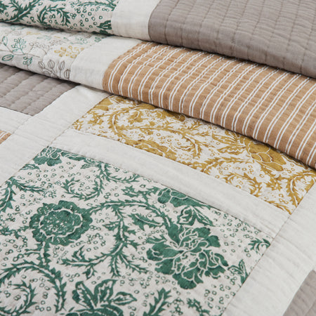 A classic patchwork of floral prints and stripes in rich colors on a neutral creme base bring a sense of vintage elegance to your bed. The Dorset Twin Quilt measures 68 by 86 inches. The quilt is backed by a warm and neutral grey-brown fabric and features cotton batting for extra warmth and high-quality stitching with channel and stitch in the ditch quilting techniques. A blend of cotton and linen creates a cool, soft touch with superior durability and easy care. The lightweight bedspread is machine washable and iron safe. Coordinates with the Dorset Collection from VHC for a complete vintage farmhouse look.