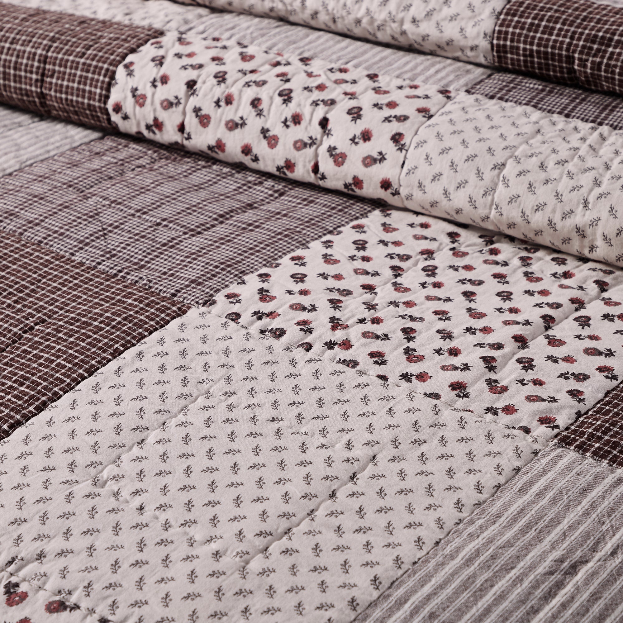 - Coffee Brown Patchwork - Coffee brown, taupe, and highlights of mauve red are woven together with a mix of small-scale ditsy floral prints and simple stripes and plaids. Reverses to coffee brown plaid.