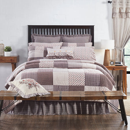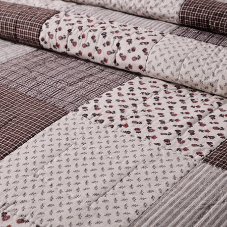 A stunning patchwork of white, coffee brown, soft taupe and splashes of mauve red enhance the look of your bedroom and add an elegant, French country look to your home. The Florette Queen Quilt measures 90 by 90 inches and features square quilt blocks with a variety of ditsy florals and micro check plaids. The 100 percent cotton quilted bedspread includes warm, cotton batting and is backed by a solid coffee brown plaid. Machine washable and iron safe, this durable quilt is constructed with stitch in the ditch and echo quilting techniques for superior resistance to normal wear and tear. Coordinates with the Florette Collection by VHC for feminine, cottage-inspired style with the quality you can expect from over 20 years of happy customers.