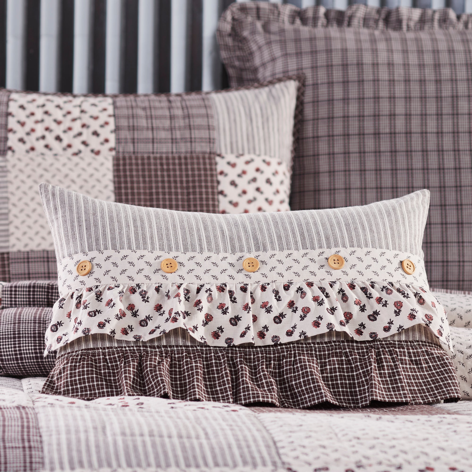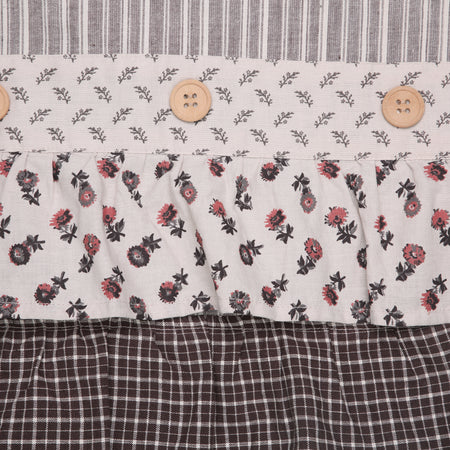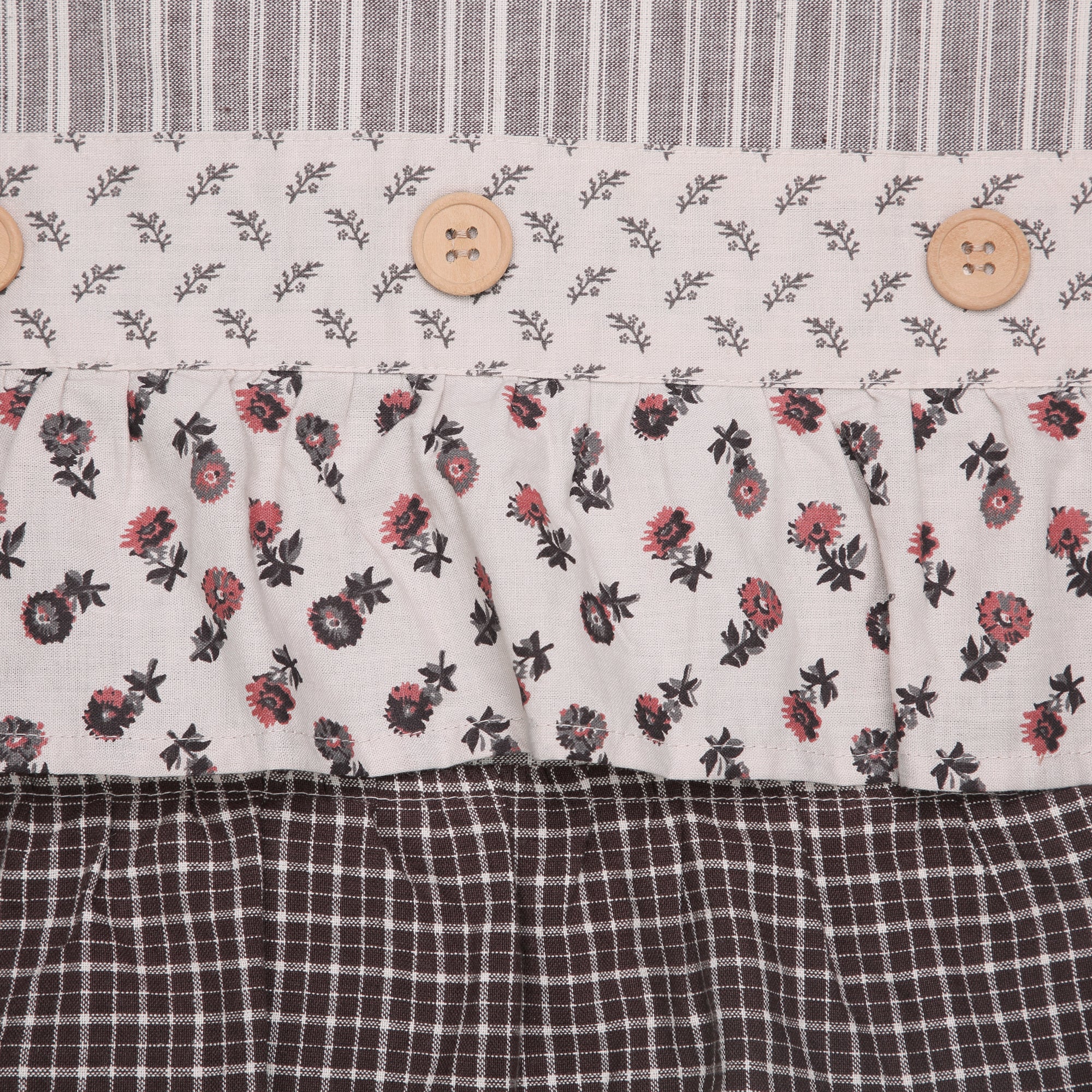 - Vintage Details - Rich vintage details abound coming together for an elegant accent with cozy cottage vibes. Includes a soft ruffle in ditsy floral, coffee-toned microcheck, and a floral stripe with decorative wooden buttons.