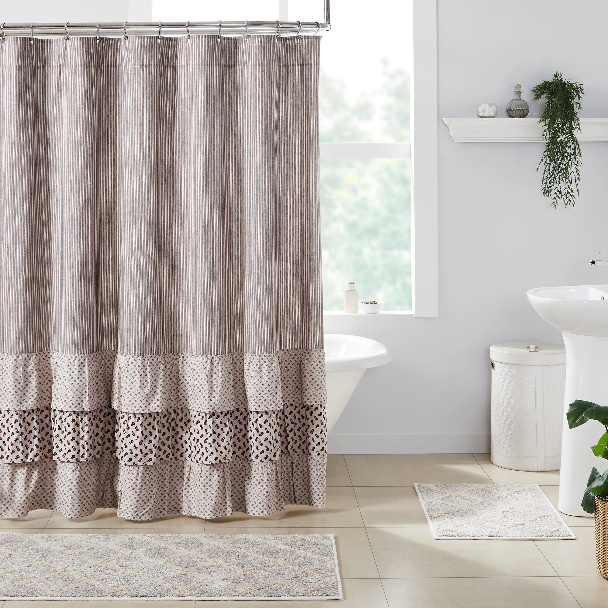 The Florette Ruffled Shower Curtain transforms your bath with classic cottage charm. Features a striped base and prominent ruffles in warm white, coffee brown, and red in a mix of floral patterns. Measures 72 by 72 inches to fit standard sized showers and baths. Easily hang this classic country bath curtain with shower hooks of your choosing (not included) using the button holes attached. A 3 rod pocket is also available as an alternative hanging method.