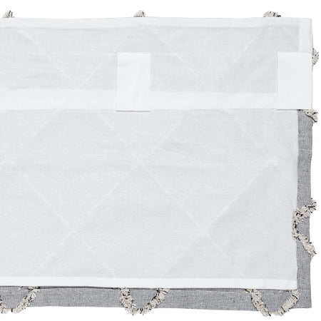 The perfect pop of texture. Create a soft, country look with the Frayed Lattice Creme & Black Valance 16x60. Textured fabric features a tufted, geometric design creating a lattice look perfect for modern farmhouse decor. Features a soft, white cotton lining to prevent fading and a rod pocket for easy hanging.