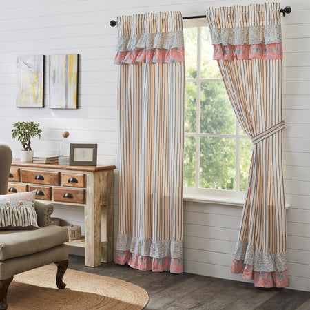 Create the fairytale cottage of your dreams with romantic ruffles and charming floral prints. The Kaila Blue Ruffled Panel Set of 2 84x40 features layered ruffled fabric. A blue and creme stripe creates a focal point for the curtain with two layers of charming floral prints above and below. Features soft, white cotton lining to filter sunlight and prevent fading. Includes a rod pocket and hidden loops for easy hanging.
