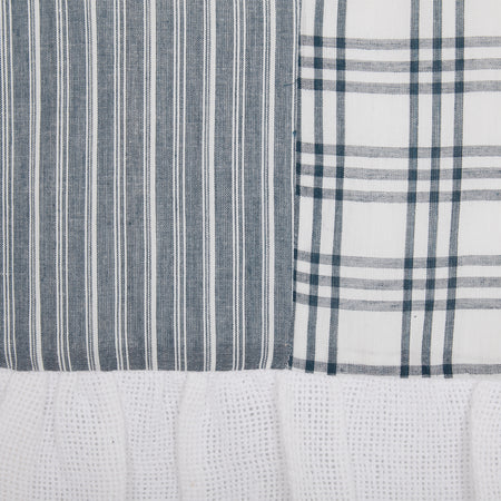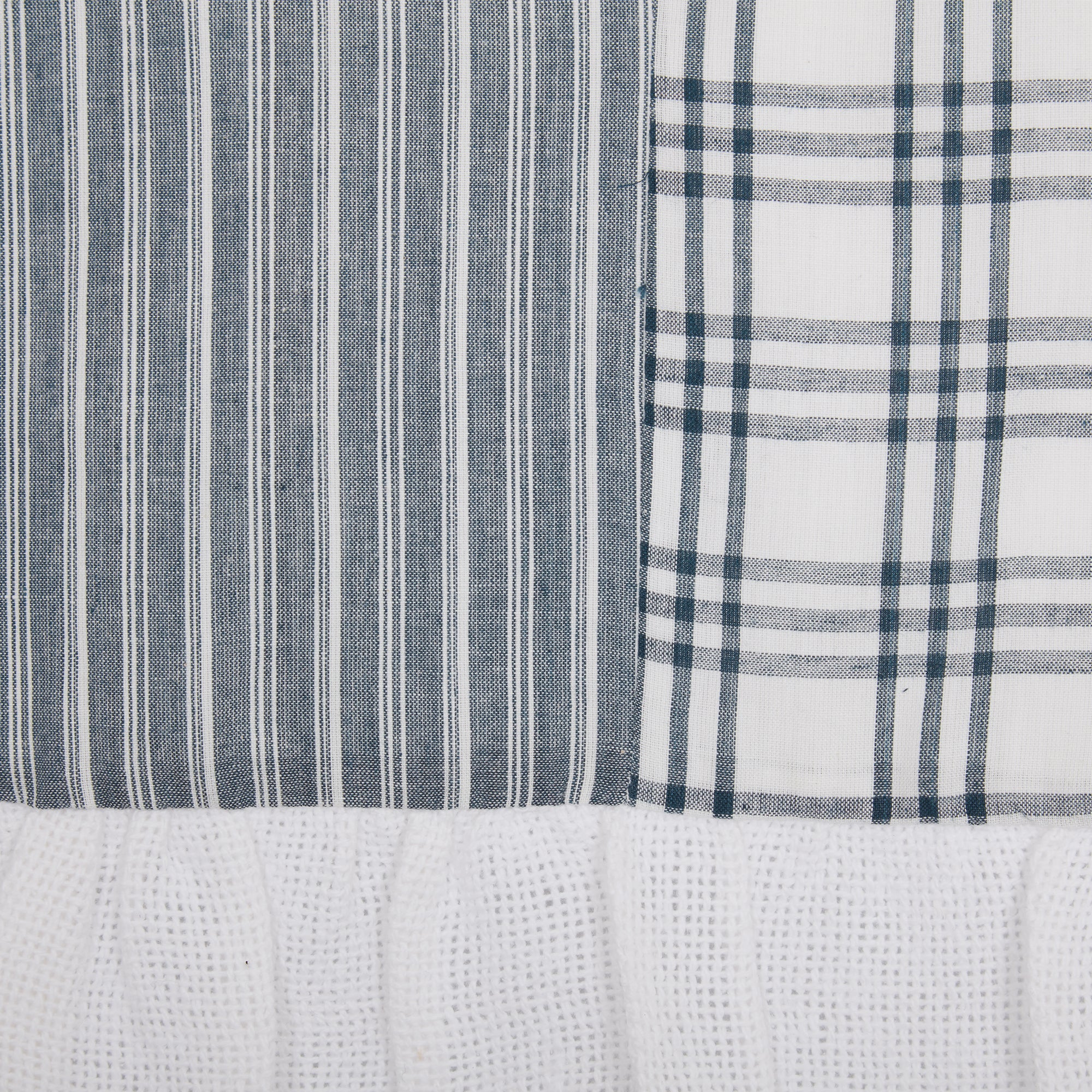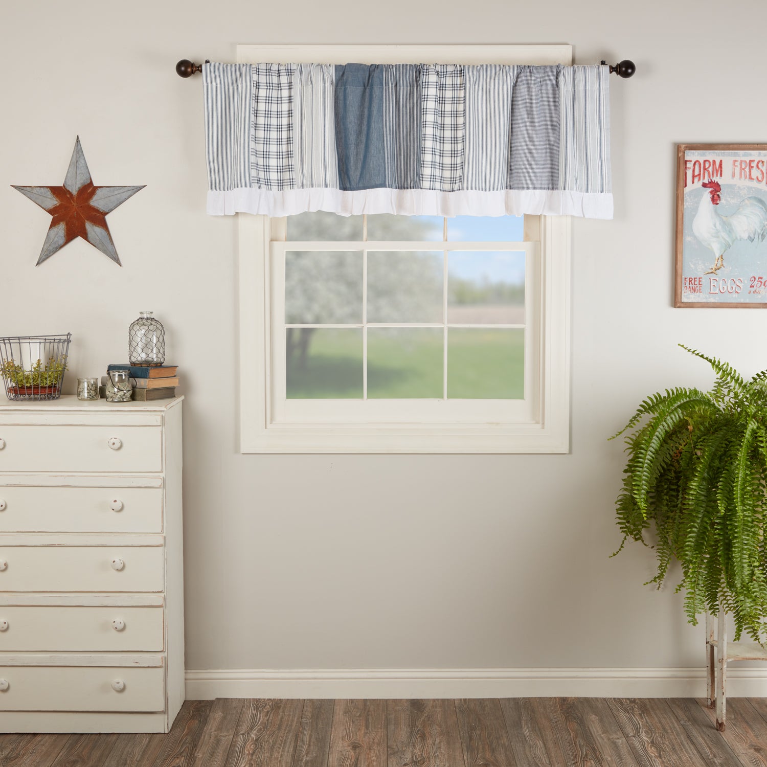 A mix of stripes and plaids comes together to create a farmhouse look that proves that neutral doesn't have to be boring. The Sawyer Mill Blue Patchwork Valance 19x72 features a mix of denim blue and white patterns with a thick band of ruffled white burlap cotton along the bottom. A soft, white cotton lining helps to prevent fading and filter sunlight while a 3.25