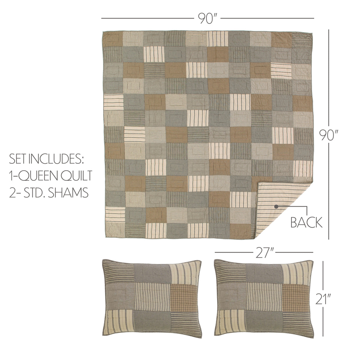 - Set Includes - This 3 piece set features 1 patchwork quilt (90x90) and 2 shams (21x27) in a farmhouse, country style. For a collected look throughout the home, mix and match with the rest of our Sawyer Mill collections.