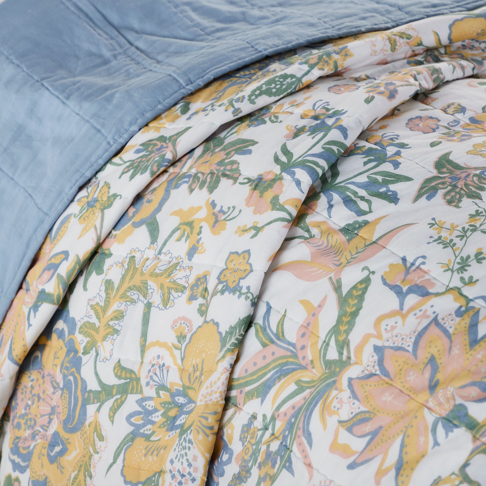 - Queen Size Quilt - Includes one 90 by 90 inch 100 percent cotton quilt. Fade resistant fabric retains color wash after wash. Reverses to solid dusty blue.