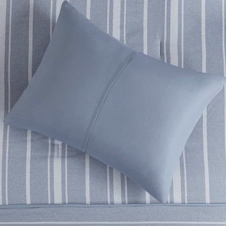 A fresh take on a classic design, the Beautyrest Kent comforter set introduces a casual look that’s always in style. The blue herringbone pattern is paired with a stripe design in a lighter shade of blue for a practical, yet charming allure. Pleated details add a dimensional element to the comforter, elevating the design. Also included are matching shams that pair handsomely with the striped comforter, completing the bedding set.