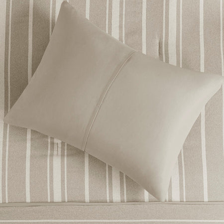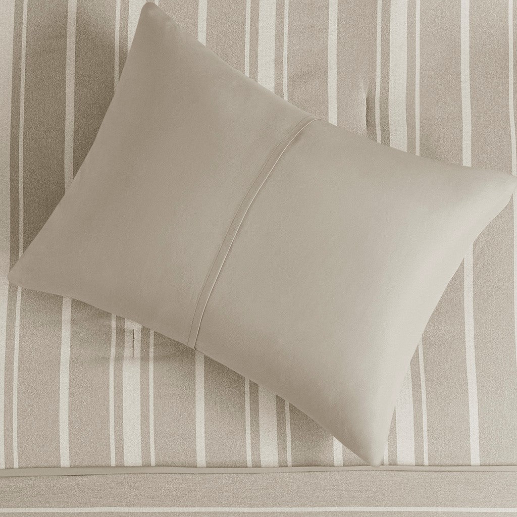 A fresh take on a classic design, the Beautyrest Kent comforter set introduces a casual look that’s always in style. The taupe herringbone pattern is paired with a stripe design in a lighter shade of taupe for a practical, yet charming allure. Pleated details add a dimensional element to the comforter, elevating the design. Also included are matching shams that pair handsomely with the striped comforter, completing the bedding set.