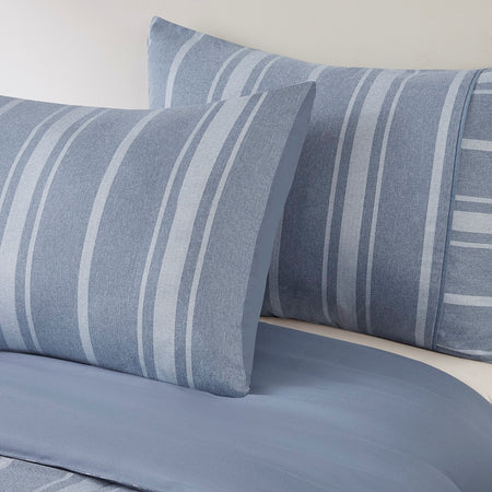 A fresh take on a classic design, the Beautyrest Kent duvet cover set introduces a casual look that’s always in style. The blue herringbone pattern is paired with a stripe design in a lighter shade of blue for a practical, yet charming allure. Pleated details add a dimensional element to the duvet cover, elevating the design. Also included are matching shams that pair handsomely with the striped duvet cover, completing the bedding set. Inserts for duvet covers are sold separately.
