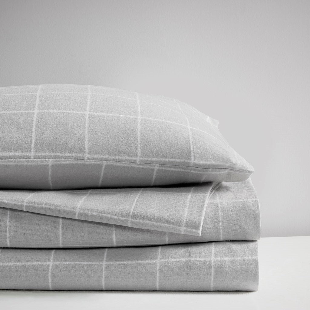 Oversized Cotton Flannel 4 Piece Sheet Set - Grey Windowpane - King Size