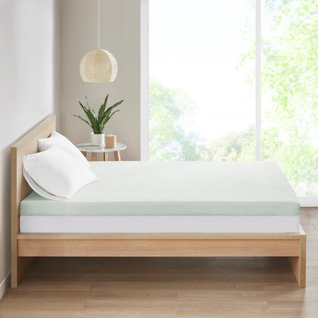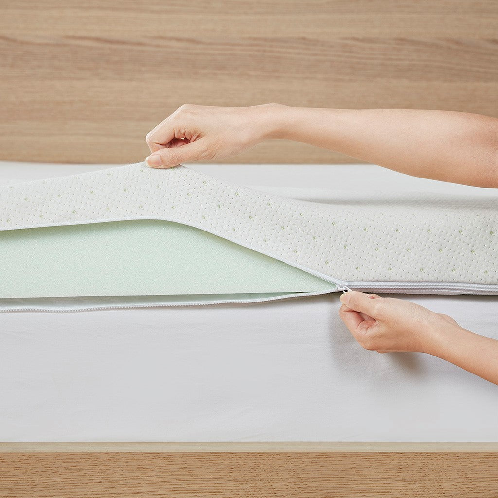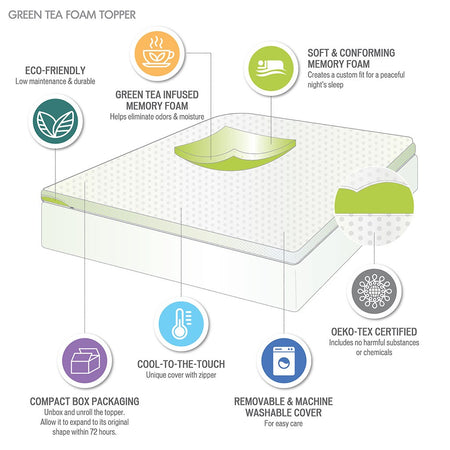 The Clean Spaces 3" Green Tea Foam Topper with Cooling Removable Cover provides eco-friendly and durable comfort to your bed. Made from soft comforting memory foam, this mattress topper creates a custom fit for your body to give you a peaceful night's sleep. A Green Tea infusion is added to the memory foam to maintain freshness and help eliminate odors, allowing you to wake up feeling restored and refreshed. The topper also comes with a zippered machine washable removable cover that features a unique fabrication that's always "crisp and cool to the touch". This foam topper is also OEKO-TEX certified, meaning it does not contain any harmful substances or chemicals to ensure quality comfort and wellness. The packaging technology allows the topper to be efficiently compressed into one box that's easily shipped to your door. Simply unbox, unroll, and this topper does the rest, expanding to its original shape within 72 hours.