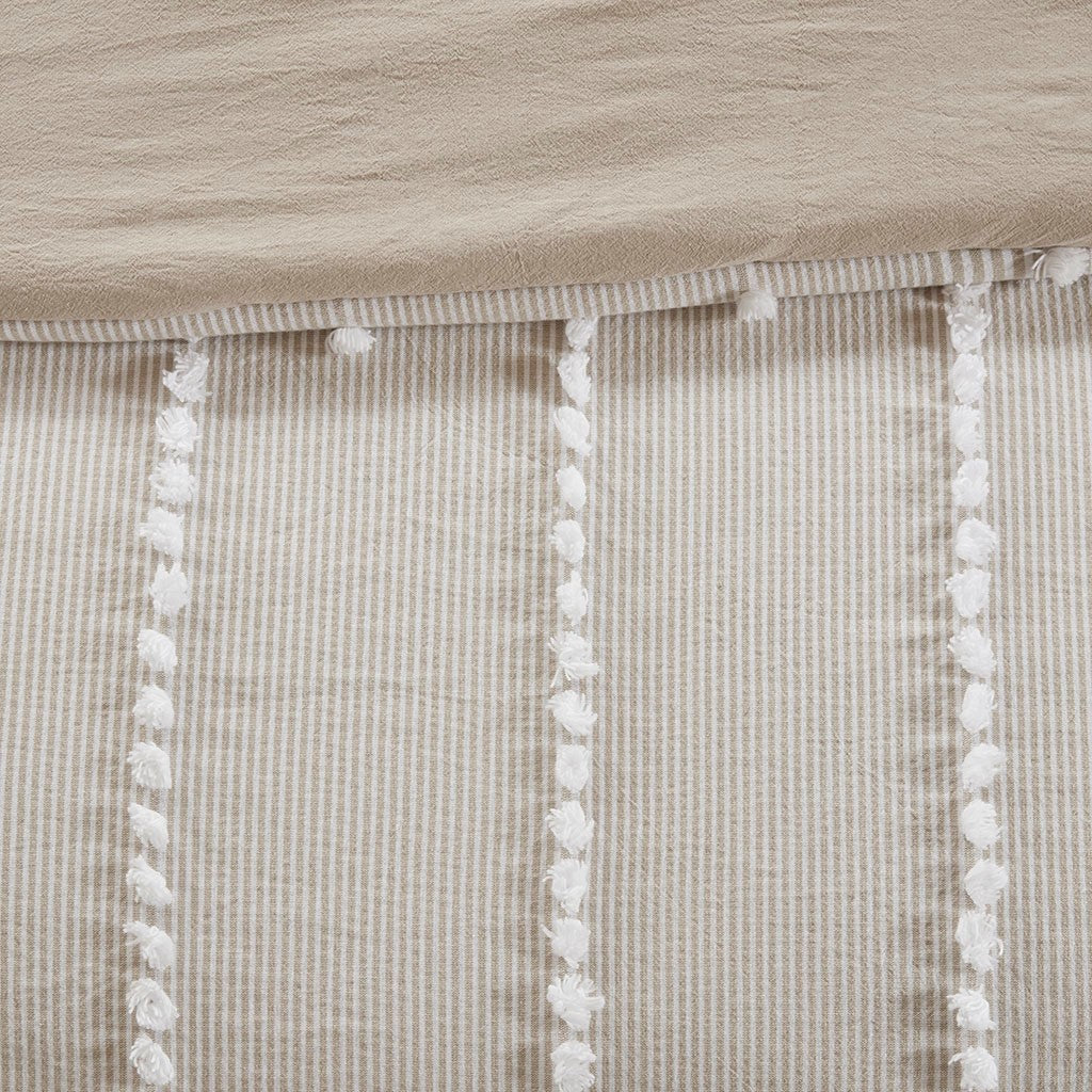 Update your bedroom with the casual beauty of the Harbor House Anslee Cotton Yarn Dyed 3 Piece Duvet Cover Set. This cotton yarn dyed duvet cover showcases stripes of various widths in soft taupe and white hues. Tufted chenille details add alluring texture and dimension and flaunt a chic, farmhouse appeal. A solid taupe reverse complements the top of the bed, while two cotton shams reiterate the design of the duvet cover for a coordinated look. Button closures and four inner ties allow you to place and secure a comforter insert (not included) within the duvet cover, for added warmth and comfort. Made from 100% cotton, this duvet cover will provide you with the utmost comfort and give you bedroom a refreshing update. This bedding set is also OEKO-TEX certified, meaning it does not contain any harmful substances or chemicals, ensuring quality comfort and wellness. Due to the nature of the chenille fabric, some shedding will occur naturally in the first 3-4 washes.