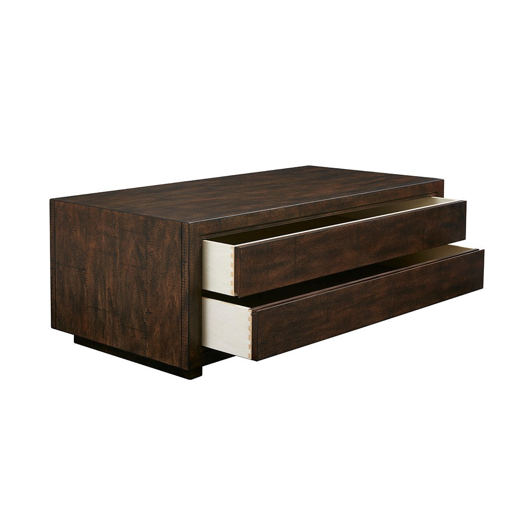 The Harbor House Bay Large Coffee Table offers a simple yet elegant update to your living room. This rectangular coffee table flaunts a dark mahogany wood finish that creates a rich and sophisticated look. An edge-pull drawer provides plenty of storage space for your blankets and other essentials. Made from MDF with a veneer top and a solid wood base, this coffee table provides a chic addition to your living space. No assembly required. Drawer weight capacity: 75 lbs.