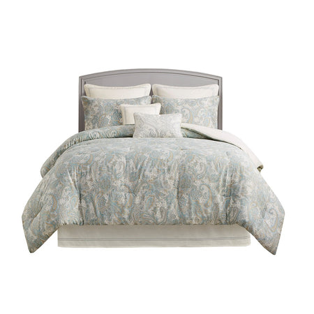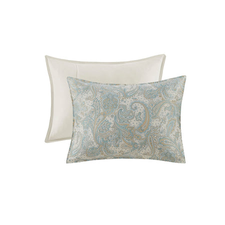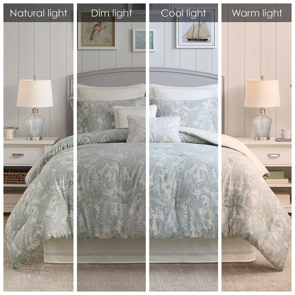 The Harbor House Chelsea bedding collection features a beautiful paisley print in soft blues and khaki on a soft ivory sateen fabric. Oversized and overfilled, this comforter set offers warmth and comfort to your room. The bed set is machine washable for easy care and includes one comforter, one satin stitch embroidered border style bed skirt, and two shams. Top off the look even more with the accessory items - Euro shams and decorative pillows which are sold separately. This bedding set is also OEKO-TEX certified, meaning it does not contain any harmful substances or chemicals, ensuring quality comfort and wellness. This bedding set may come in rolled or compressed packing and will need to be fluffed up. Use a steam iron to help remove wrinkles easier.
