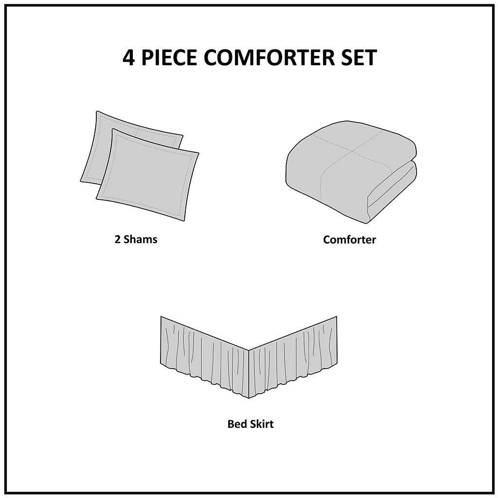 - Set includes comforter, 1 bed skirt, 2 shams