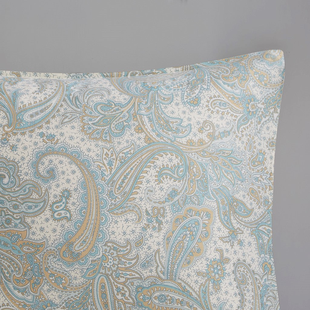 - Features an all over paisley print in soft blues and khaki on a soft ivory sateen fabric