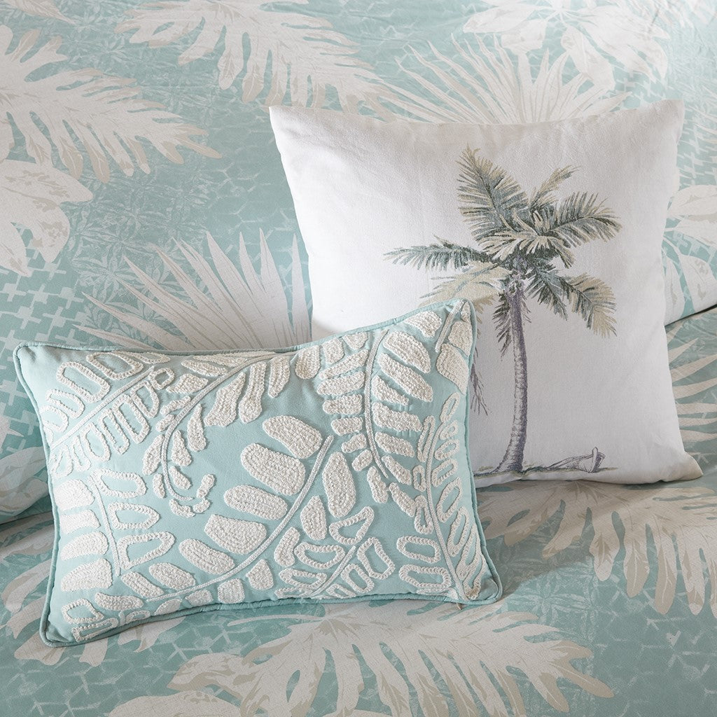 Transform your bedroom into a peaceful oasis with the Harbor House Palm Grove 6 Piece Comforter Set. A refreshing coastal pattern of lush palm leaves and ferns are elegantly showcased on a seafoam ground. The same coastal motif is reiterated on the oblong pillow using textured embroidery, while the square pillow features a colored palm tree on a soft, ivory ground. The solid coordinating bedskirt completes the look and provides a clean finish. Machine washable, this set includes 1 comforter, 1 bedskirt, 2 shams, and 2 decorative pillows. This bedding set is also OEKO-TEX certified, meaning it does not contain any harmful substances or chemicals, ensuring quality comfort and wellness.