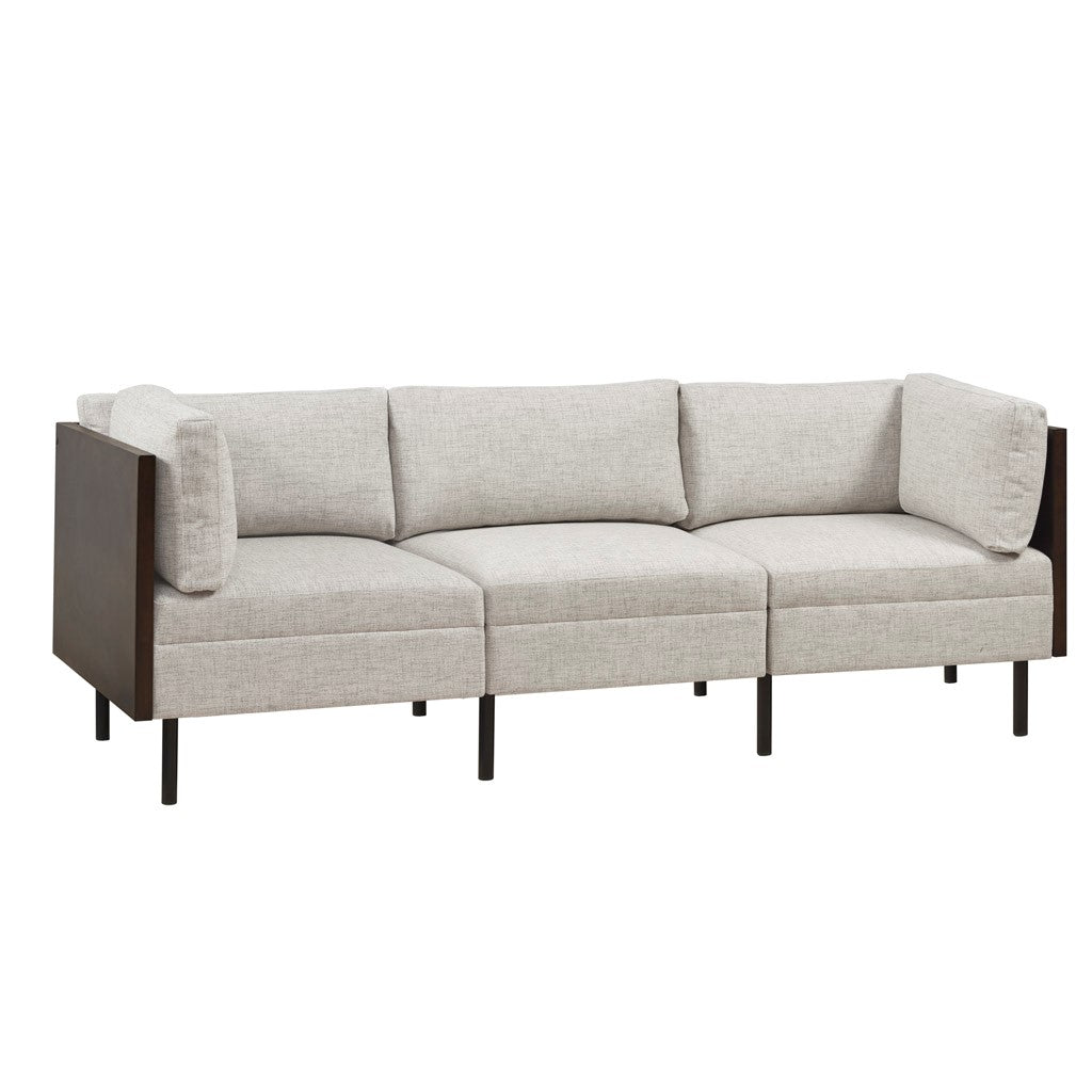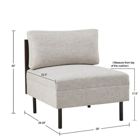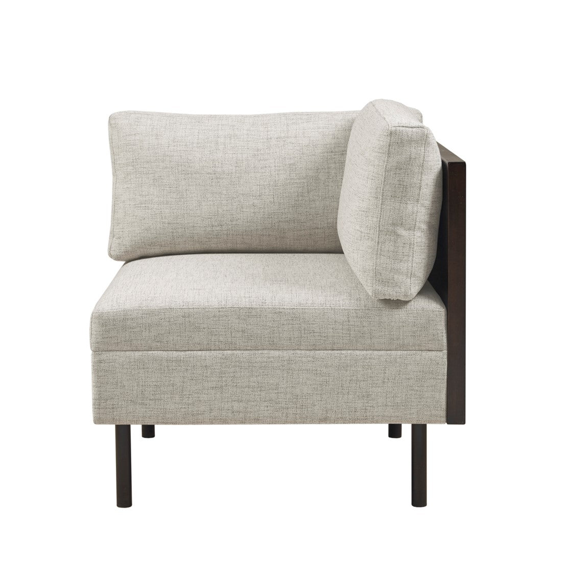 The INK+IVY Metro Modular Sectional Sofa chairs offer a modern blend of versatility and style to update your living space. The armless chair and corner chair showcase a simple and clean aesthetic that can be used as a single piece or as part of a sectional sofa. The soft brown upholstery is complemented by a dark coffee, solid veneer back and side that creates a contrasting contemporary look. The metal legs also feature a black finish to complement the overall design, while back and side pillows provide additional comfort. Assembly is required.