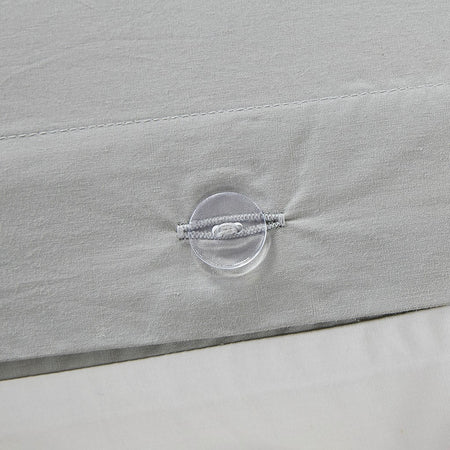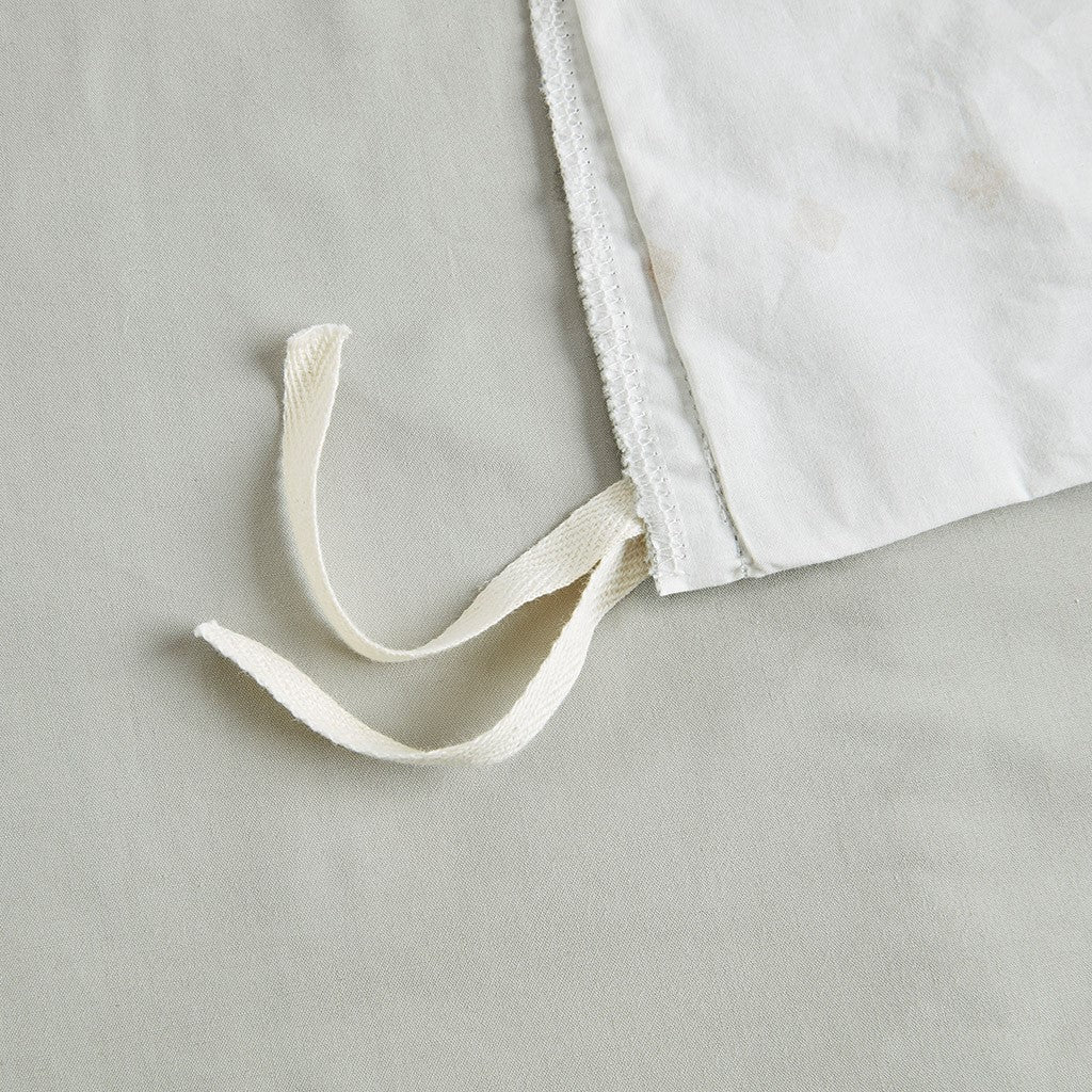 Duvet and Sham: 100% printed cotton percale with 6 rows of trims on top of bed and 1 row on the sham. Solid cotton percale reverse. Button closure at bottom of duvet. 4 corners with inside ties. Sham with 1" self flange on 4 sides, and overlap closure at back.