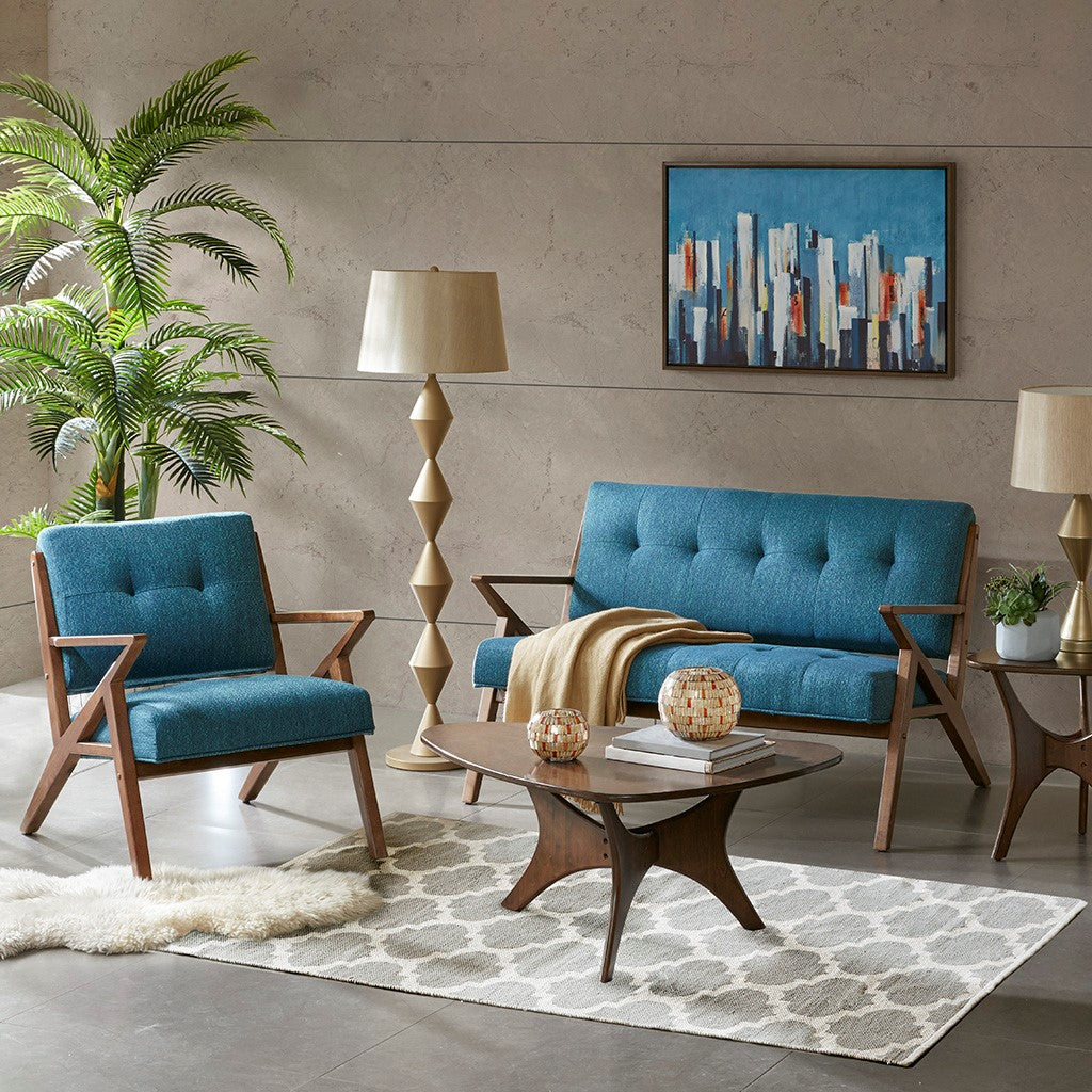 The INK+IVY Rocket Loveseat is the perfect update to a mid-century modern decor. Inspired by styles of the "Àú60s, this loveseat flaunts track arms and a refreshing blue hue that pops against the pecan wood finish. The solid wood frame and high-density foam filling provide long-lasting support and comfort. Place this loveseat in your living room or home office for an invigorating and appealing touch. Leg assembly is required. Max weight capacity: 600 lbs.