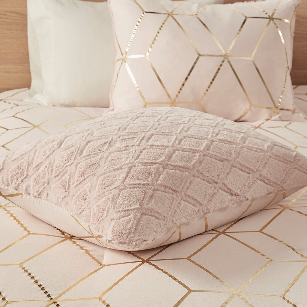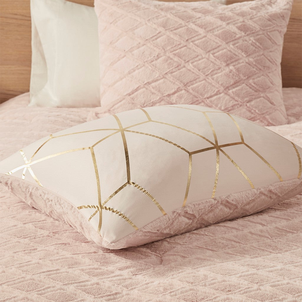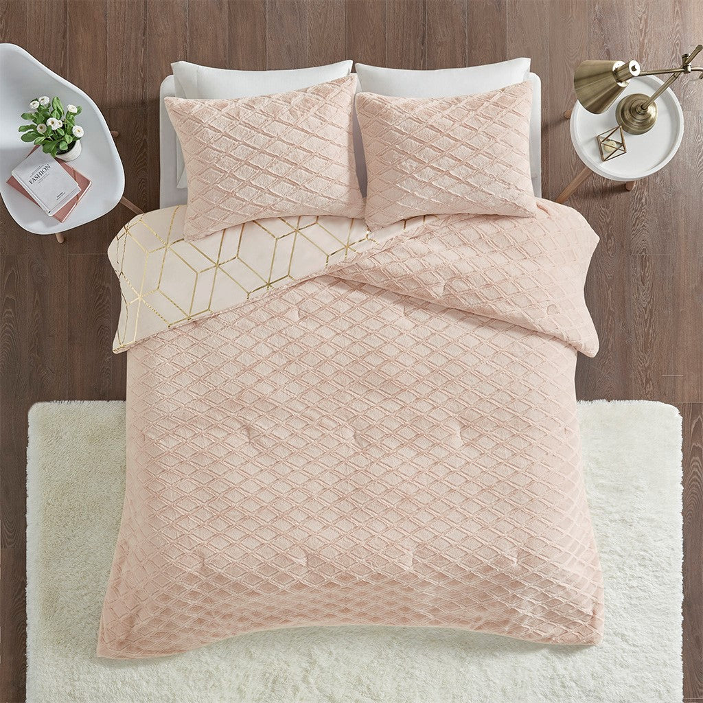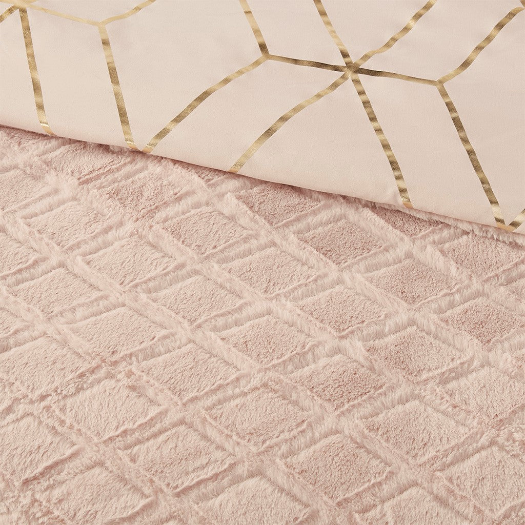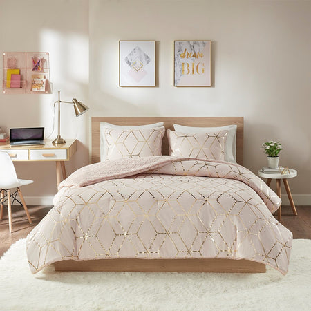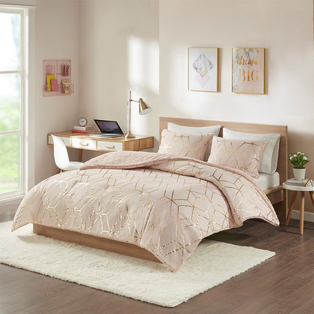 The Intelligent Design Ainsley Metallic Print Reversible Comforter Set offers incredible value and style for your bedroom decor. This reversible comforter features a gold metallic geometric print on a blush base that reverses to a blush pressed diamond faux fur, for a chic contemporary look. Two matching shams (1 for Twin Sizes) mirror the reversible design of the comforter and features hidden side zipper openings for your pillows. Hypoallergenic polyester filling in the comforter provides exceptional warmth and comfort. Machine washable for easy care, this reversible comforter set brings two stunning and modern looks to style your bedroom decor and is OEKO-TEX certified, meaning it does not contain any harmful substances or chemicals to ensure quality comfort and wellness.