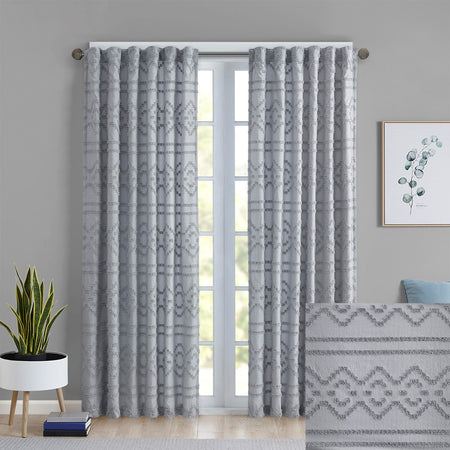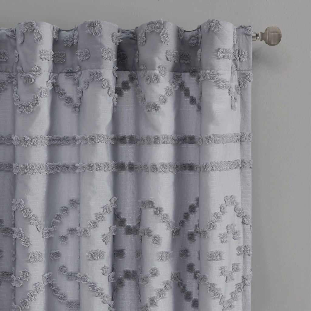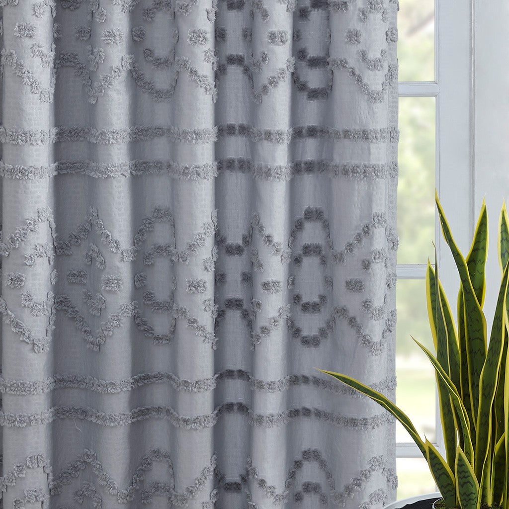 Clipped jacquard seersucker fabric. Finished with rod pocket and back tabs; fits up to 1.25 inches diameter rod.