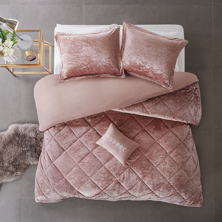 Create a luxuriously comfortable bedroom space with the Intelligent Design Felicia 4 Piece Velvet Duvet Cover Set. The crushed velvet, blush duvet cover features a quilted diamond top that adds dimension to the glamorous look. Matching shams (1 for Twin Sizes) coordinate with the velvet duvet cover, while an oblong decorative pillow provides a perfect finishing touch. Machine washable for easy care, this velvet duvet cover set brings incredible softness and comfort with a luxurious flair to your bedroom decor. Button closures allow you to place a comforter insert within the duvet cover and internal corner ties help prevent it from shifting (Insert is NOT included).