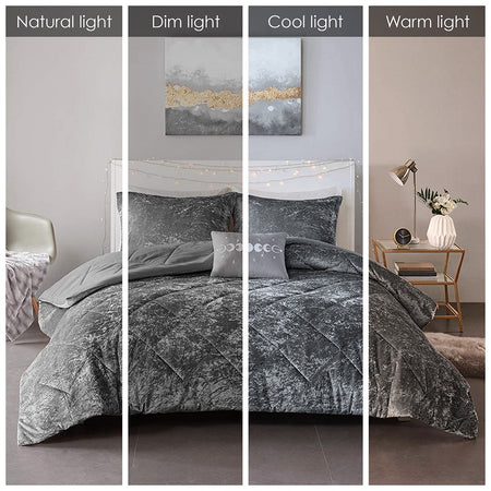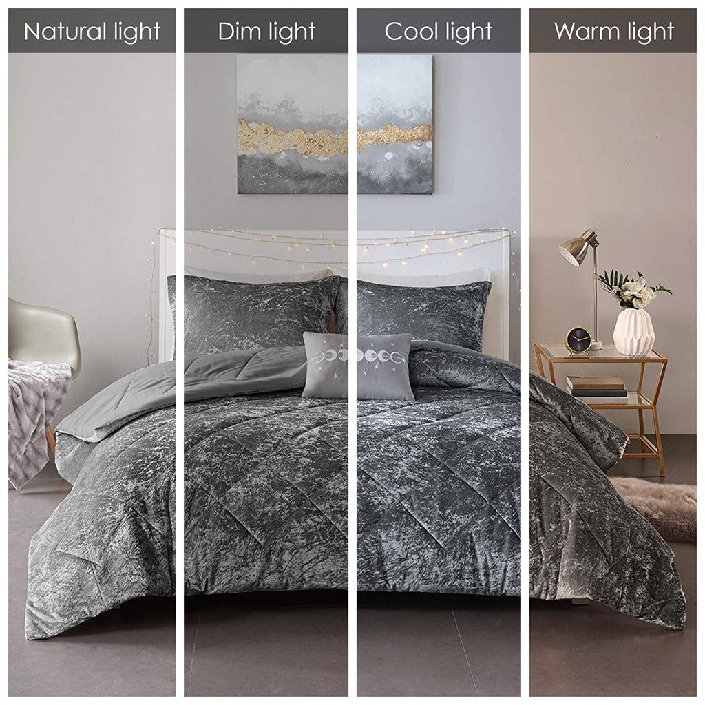 Create a luxuriously comfortable bedroom space with the Intelligent Design Felicia 4 Piece Velvet Duvet Cover Set. The crushed velvet, grey duvet cover features a quilted diamond top that adds dimension to the glamorous look. Matching shams (1 for Twin Sizes) coordinate with the velvet duvet cover, while an oblong decorative pillow provides a perfect finishing touch. Machine washable for easy care, this velvet duvet cover set brings incredible softness and comfort with a luxurious flair to your bedroom decor. Button closures allow you to place a comforter insert within the duvet cover and internal corner ties help prevent it from shifting (Insert is NOT included).