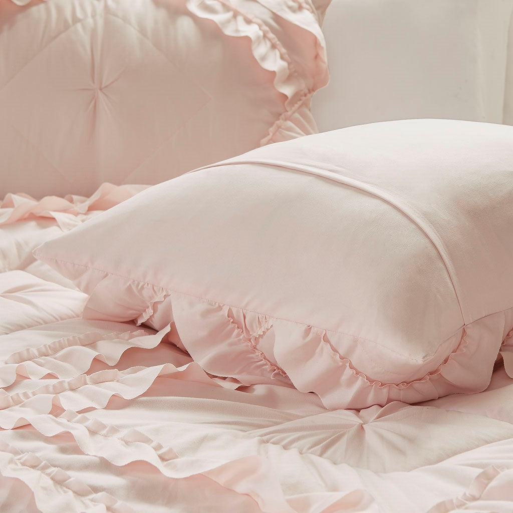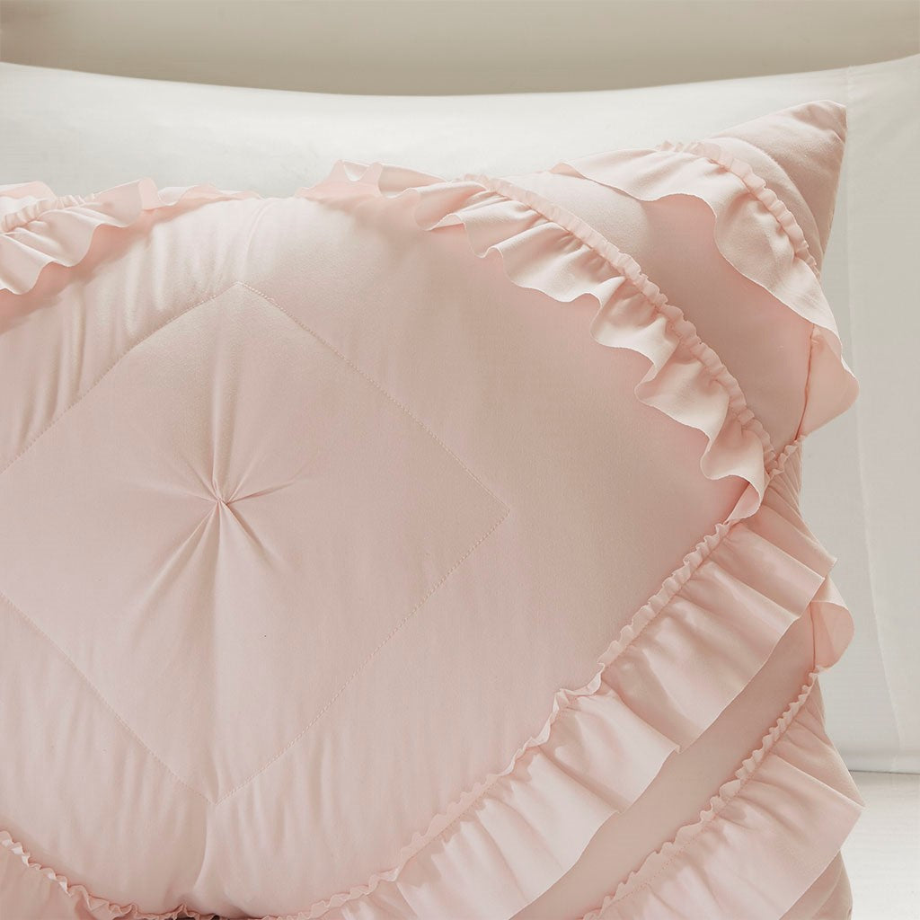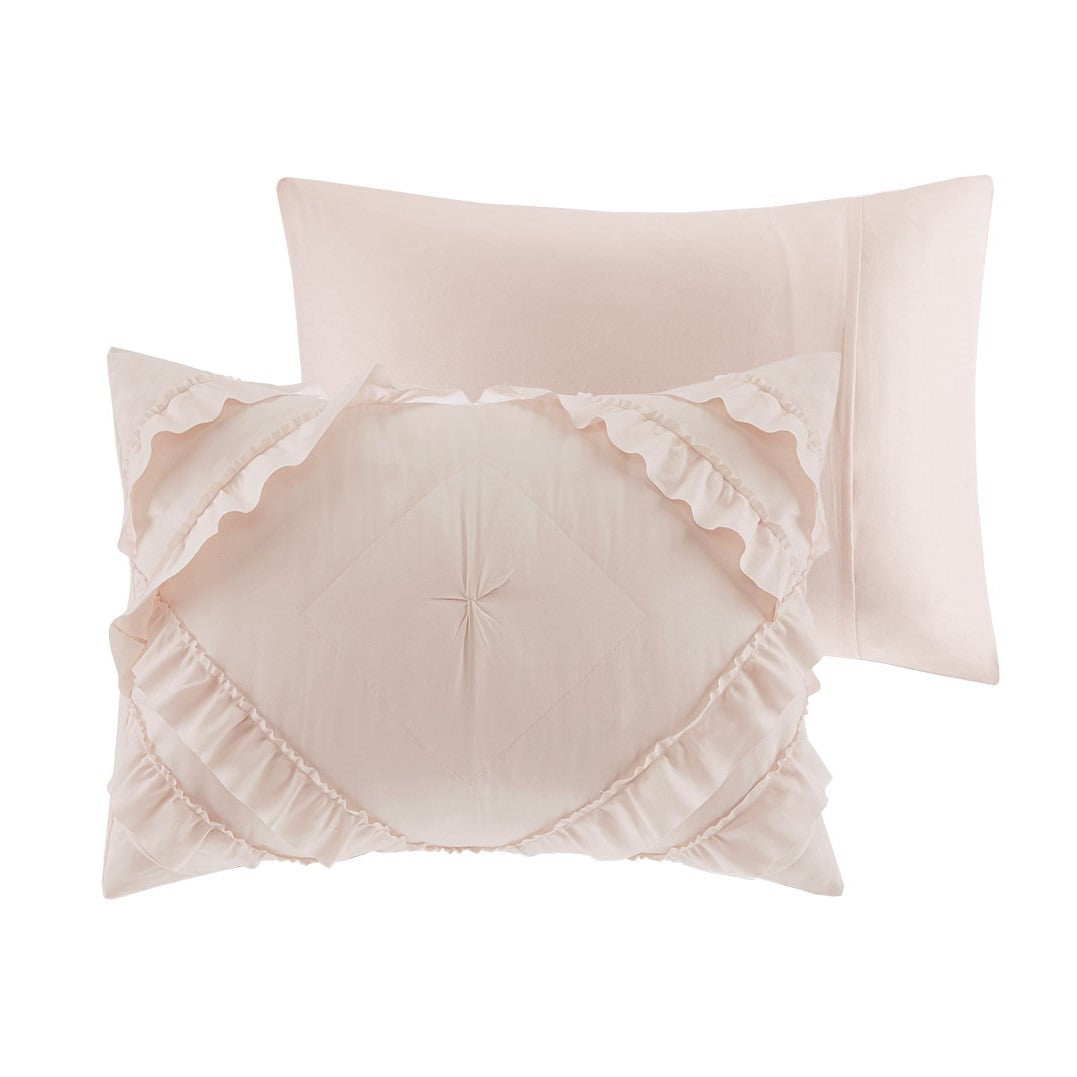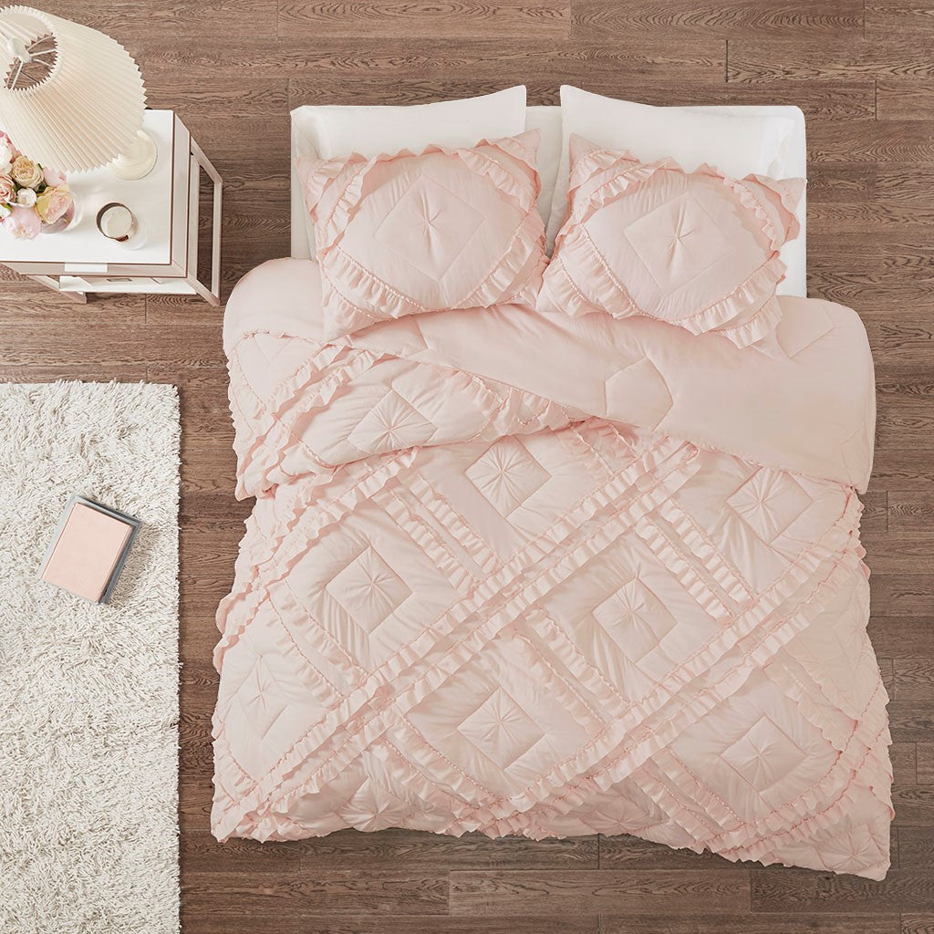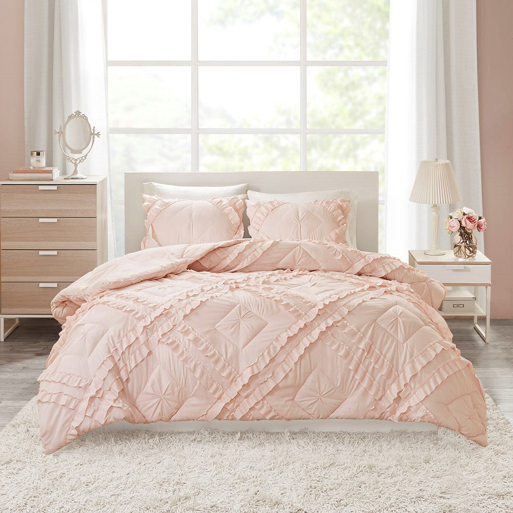 Create a cozy bedroom space with shabby chic style of the Intelligent Design Kacie Tufted Diamond Ruffled Coverlet Set. The ultra-soft blush microfiber coverlet features a tufted diamond pattern with elegant ruffles, for a charming look. The 2 shams (1 in Twin/TwinXL) match the design of the coverlet to complete cottage-inspired aesthetic. Cotton-filled quilting provides a soft feel and exceptional comfort. This bedding set uses an antimicrobial treatment that provides built-in freshness protection, reducing the growth of odor causing bacteria to keep fabric lasting longer.