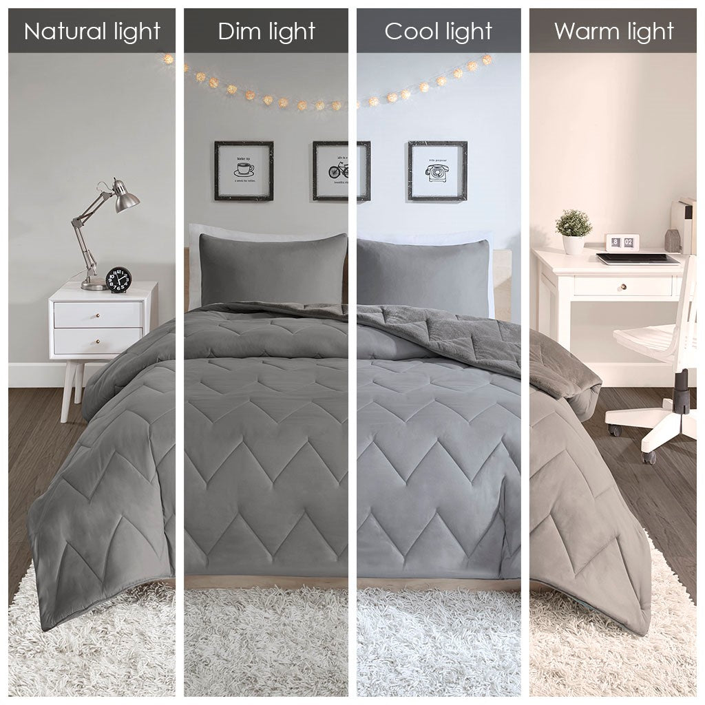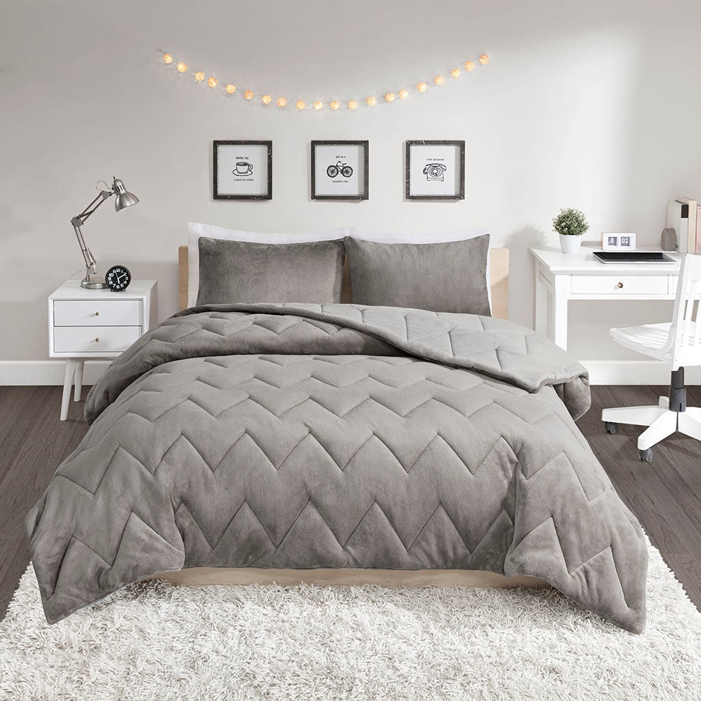 Perfect for going back to school, the Intelligent Design Kai Chevron Quilted Reversible Comforter Mini Set provides a chic and comfortable update to your bedroom. The solid grey comforter features a chevron quilting pattern that adds a charming touch. Color coordinated sham(s) complement the top of the bed, while zipper closures completing the look. Both the comforter and the sham(s) are reversible with an ultra-soft microfiber that reverses to a cozy plush fabric that provides incredible comfort. Simple and versatile, this reversible comforter mini set is great for a dorm room or teen bedroom setting and is OEKO-TEX certified, meaning it does not contain any harmful substances or chemicals to ensure quality comfort and wellness. Set includes: 1 comforter and 2 shams (1 sham for twin size).