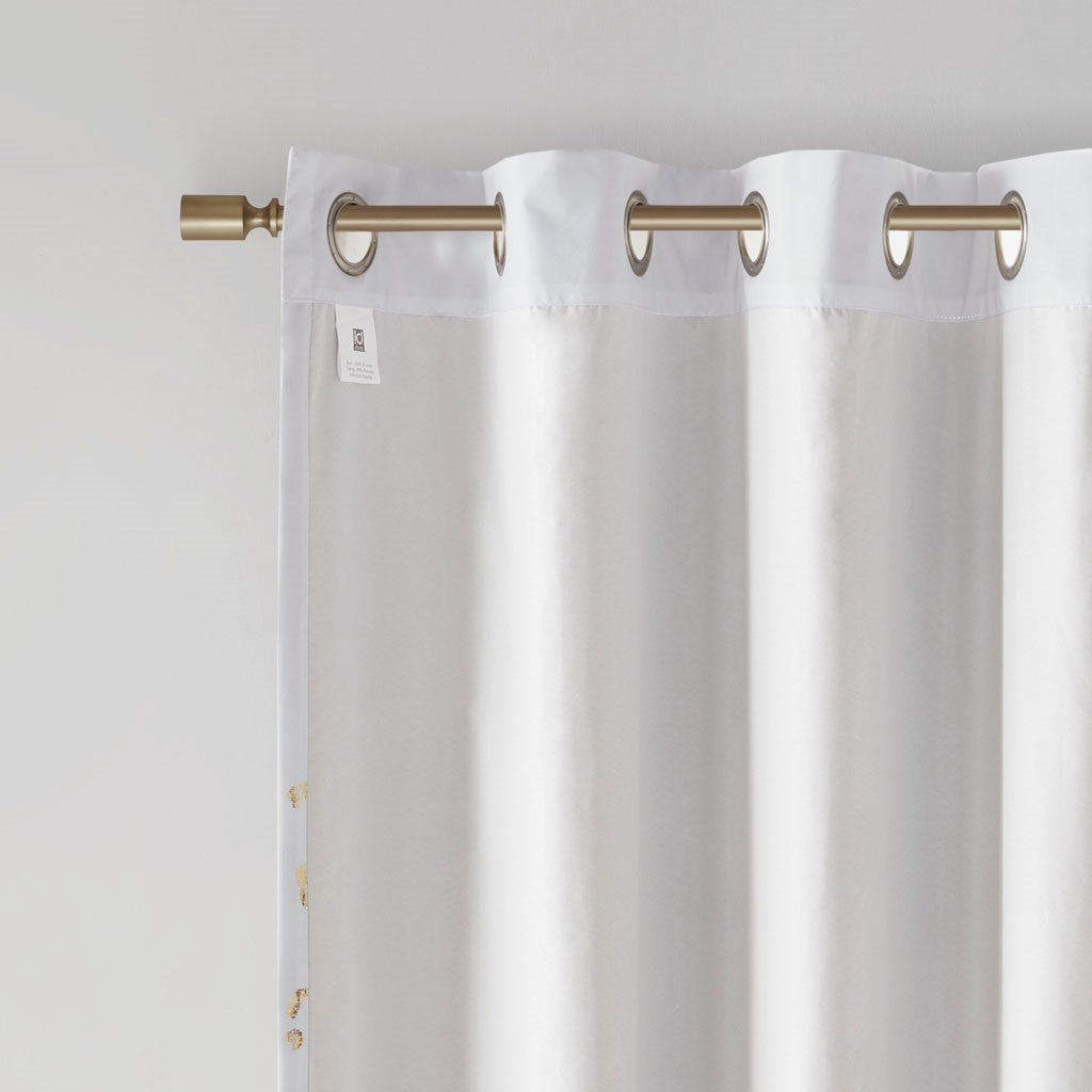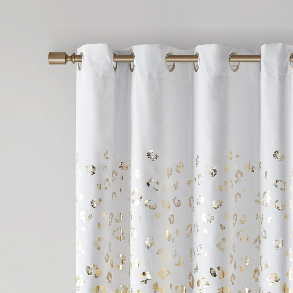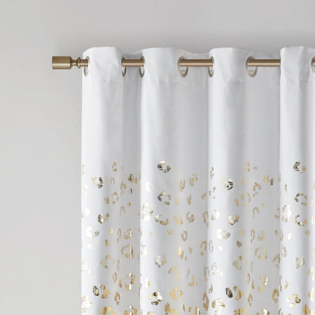 Add a touch of glam to your room with the Intelligent Design Lillie Grommet Top Metallic Animal Printed Total Blackout Curtain. A gold metallic animal print shines on the ultra-soft brushed white microfiber fabric to create a fun and glam modern look; while the 2 Pass foamback total blackout liner provides a thermal energy efficient barrier that helps block any exterior light and noise intrusion, for the highest level of privacy. This total blackout window panel is finished with an antimicrobial treatment providing built in freshness protection, inhibiting growth of odor causing bacteria, and keeping linen newer, longer. While also achieving the OEKO-TEX certification, meaning it does not contain any harmful substances or chemicals, ensuring quality comfort and wellness. Silver grommet top finish makes this curtain easy to hang, open, and close panels throughout the day; while fitting up to a standard 1.25"Â diameter rod. As shown in the image, 2 curtain panels need to be purchased to provide coverage for any standard size window. Coordinating bedding is also available and sold separately.
