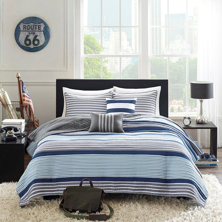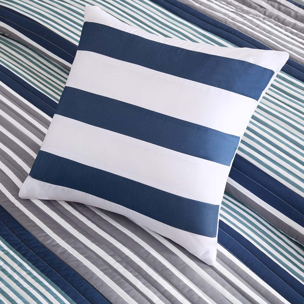 Give your bedroom a fresh new look with the Intelligent Design Paul Reversible Coverlet Set. This quilted coverlet features a modern striped print with wide and thin stripes in white, grey, navy, and teal with a solid grey reverse to create a handsome look. The 2 matching shams (1 in Twin/TwinXL) also showcase a simple stripe pattern that pairs perfectly with the comforter, while 2 decorative pillows add the finishing touches. Machine washable for easy care, this striped coverlet set uses an antimicrobial treatment that provides built-in freshness protection, reducing the growth of odor causing bacteria to keep fabric lasting longer.
