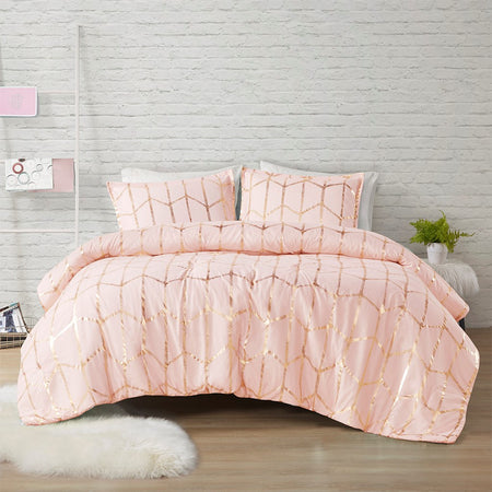 Freshen up your bedroom with the enchanting style of Intelligent Design's Raina Comforter and Sham Set. The stunning comforter flaunts a geometric, metallic gold print against a soft blush ground for a fun and eye-catching look! Matching sham(s) echo the design seen on top of the bed to pull the entire ensemble together. Set includes comforter and 2 shams (1 sham in Twin/TwinXL). This bedding set also has an antimicrobial treatment that provides built-in freshness protection, reducing the growth of odor causing bacteria to keep fabric lasting longer. Items in the set may come in a rolled or compressed packaging, which will need to be fluffed up or steam ironed before use to remove wrinkles.