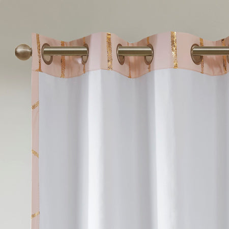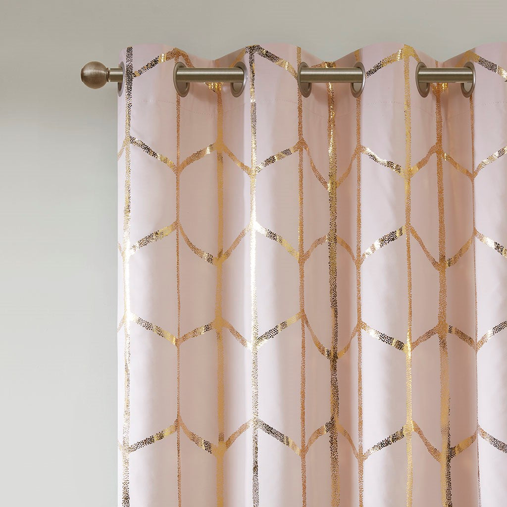 Freshen up your space with the enchanting style of Intelligent Design Raina Window Panel. The stunning panel flaunts a geometric, metallic gold print against a light blush ground for a fun and eye-catching look! Finished with a heavy 3 pass foamback liner, this panel is 100% total blackout providing energy efficiency and added privacy. Grommet top makes this panel easy to hang, open, and close through the day. Machine washable for easy care; complete the collection with coordinating bedding and shower curtain sold separately.