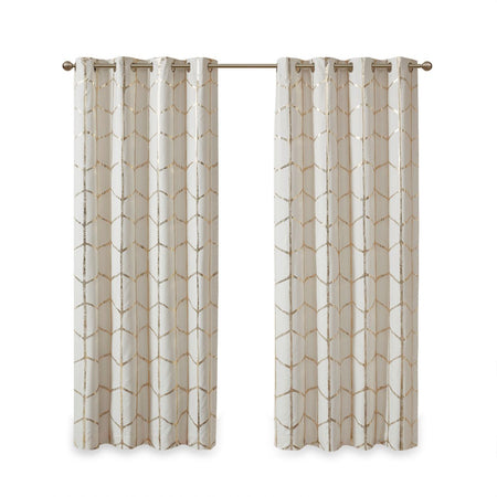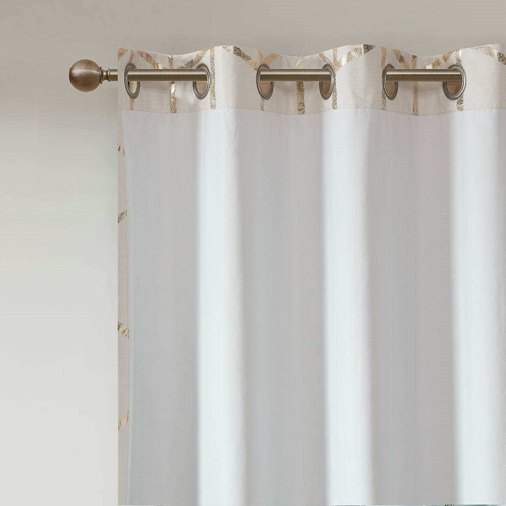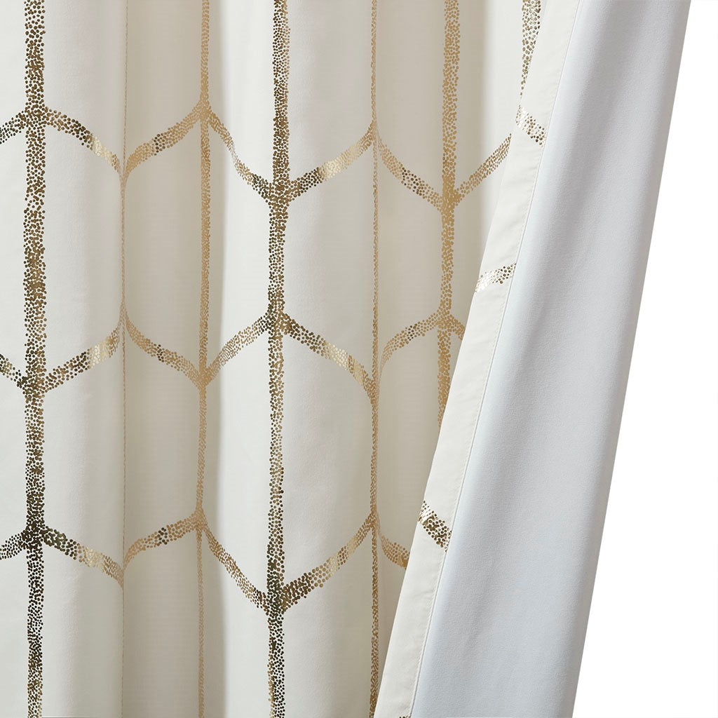 Freshen up your space with the enchanting style of Intelligent Design Raina Window Panel. The stunning panel flaunts a geometric, metallic gold print against a soft ivory ground for a fun and eye-catching look! Finished with a heavy 3 pass foamback liner, this panel is 100% total blackout providing energy efficiency and added privacy. Grommet top makes this panel easy to hang, open, and close through the day. Machine washable for easy care; complete the collection with coordinating bedding and shower curtain sold separately.