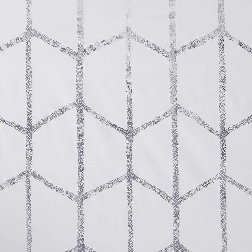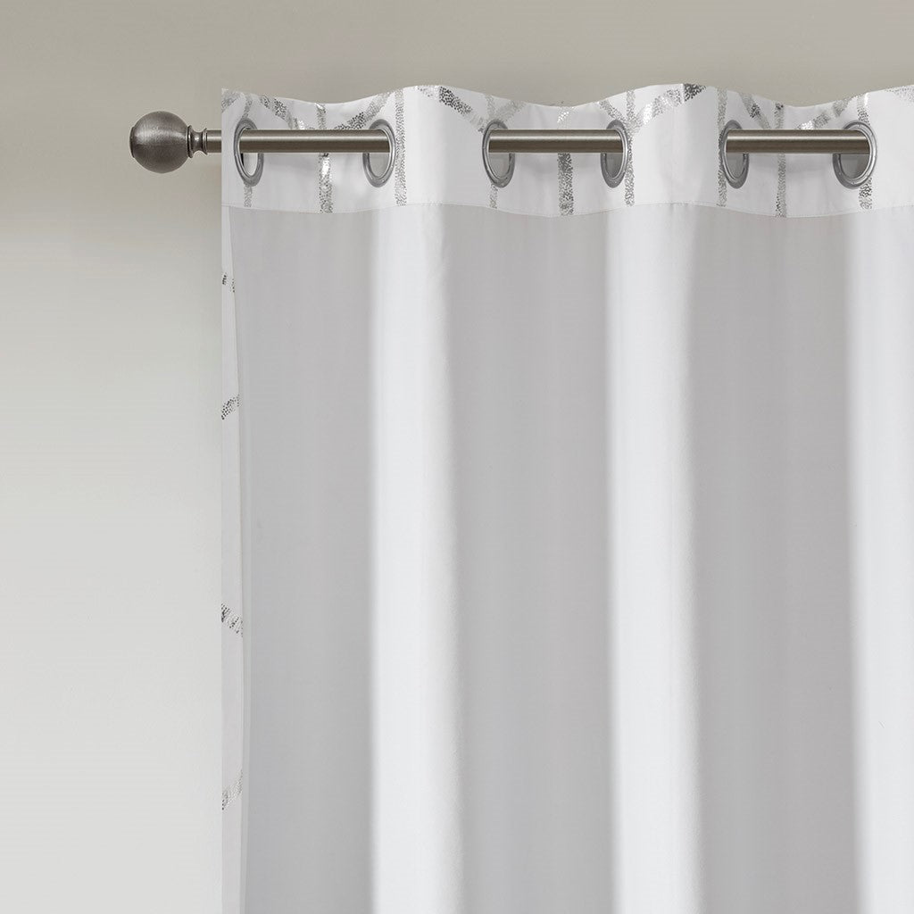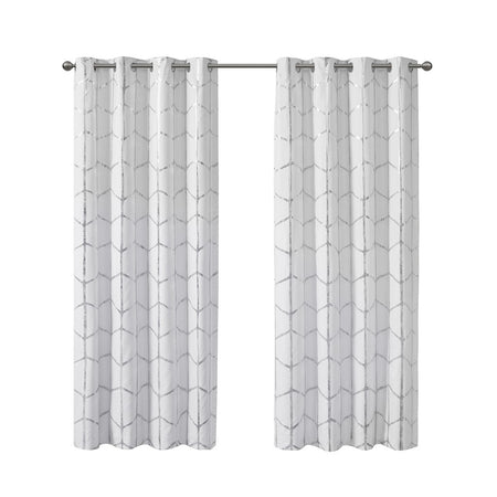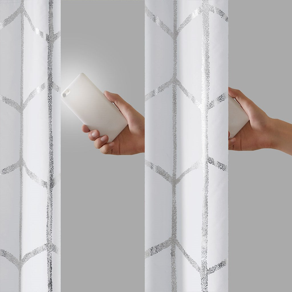 Freshen up your space with the enchanting style of Intelligent Design Raina Window Panel. The stunning panel flaunts a geometric, metallic silver print against a crisp white ground for a fun and eye-catching look! Finished with a heavy 3 pass foamback liner, this thermal panel is 100% total blackout providing energy efficiency and added privacy. Grommet top makes this panel easy to hang, open, and close through the day. Machine washable for easy care; complete the collection with coordinating bedding and shower curtain sold separately.