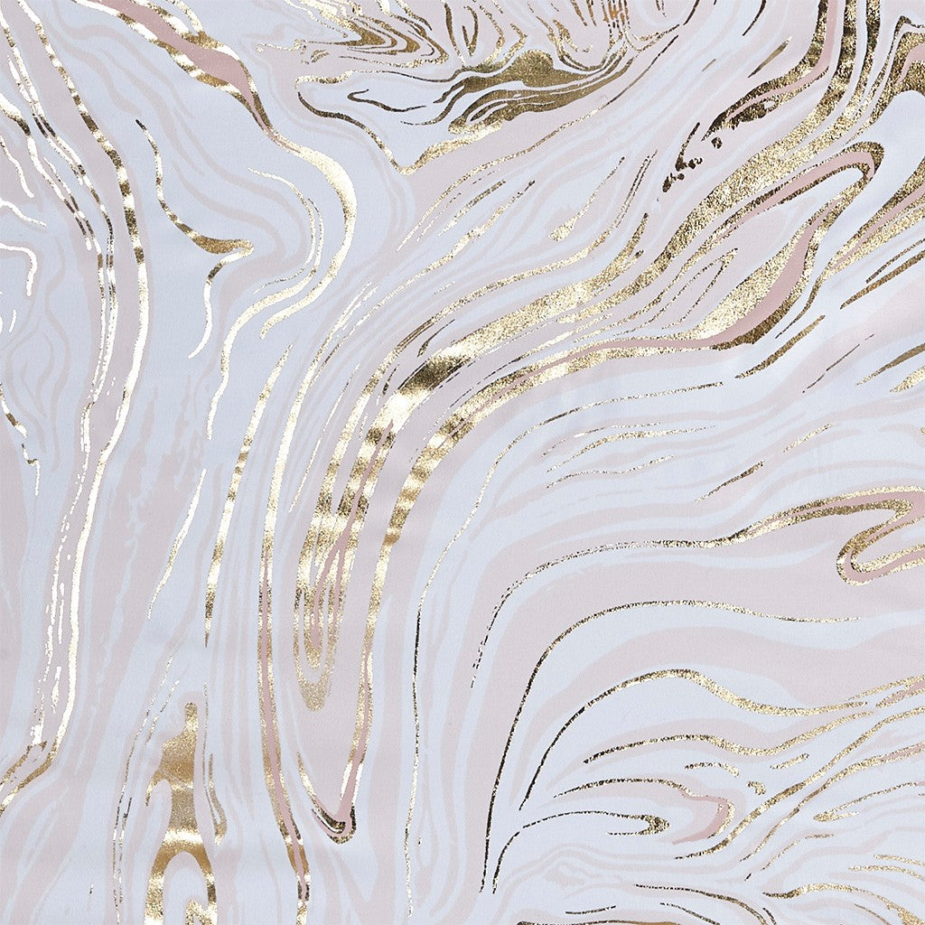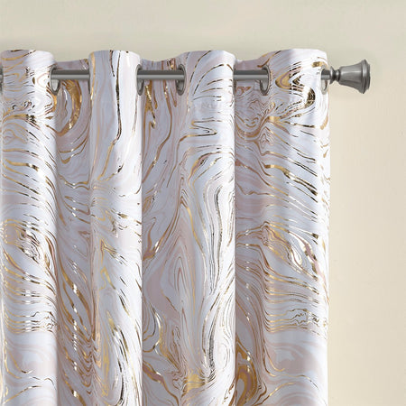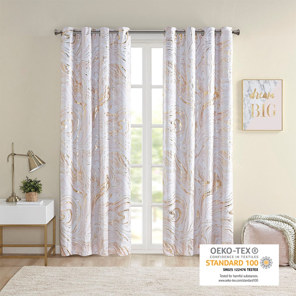 The Intelligent Design Rebecca Grommet Top Printed Marble Metallic Blackout Curtain adds a gorgeous and striking update to your bedroom decor. This window panel flaunts a gold marble metallic print on an ultra-soft blush microfiber base. Using thermal technology on the back of the curtain panel, a 3-Pass foamback liner blocks 100% exterior light and noise, while providing excellent energy efficiency and maximum privacy. This window panel is also OEKO-TEX certified, meaning it does not contain any harmful substances or chemicals, ensuring quality comfort and wellness. Easily hang this window panel using the silver grommet top that fits up to a 1.25"Â diameter rod. Machine washable for easy care, this 100% blackout panel adds a stunning modern touch to your bedroom and helps provide a restful night's sleep. 2 curtain panels must be purchase for each window for standard coverage. Coordinating bedding is available and sold separately.
