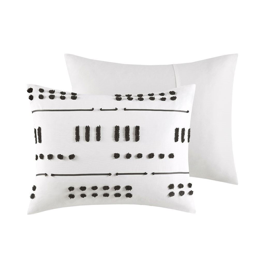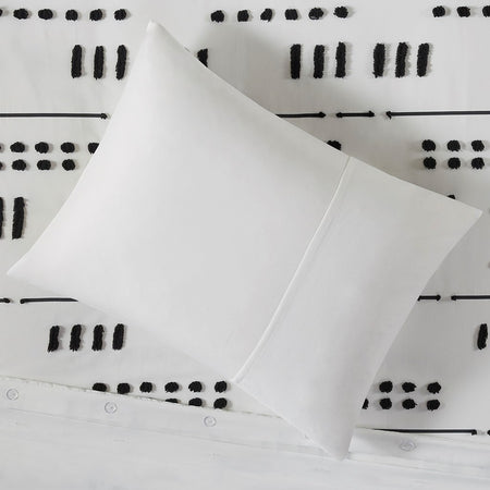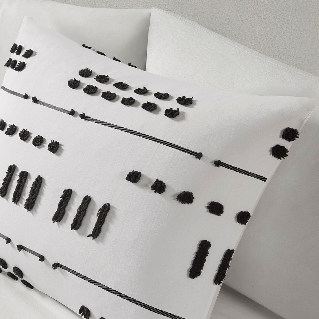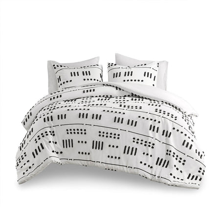 The Intelligent Design Riku Clip Jacquard Duvet Cover Set brings a bold, modern update to revitalize your bedroom. This duvet cover features an abstract black clip jacquard pattern that pops against the white base fabric for a beautiful contrasting look. The matching shams (1 in Twin/TwinXL) repeat the contemporary design of the jacquard duvet cover to give your bed a chic casual allure. Machine washable for easy care, this modern duvet cover set is OEKO-TEX certified, meaning it does not contain any harmful substances or chemicals to ensure quality comfort and wellness. An antimicrobial treatment helps reduce the growth of odor causing bacteria and keeps fabric lasting longer. A button closure at the foot end allows you to place a padded insert within the duvet cover and internal corner ties prevent it from shifting (Insert is NOT included).