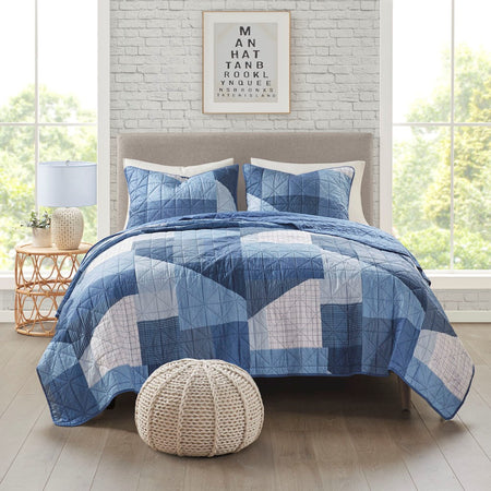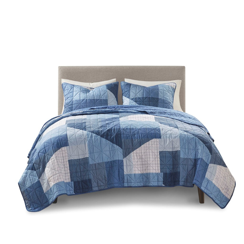 Skyler Patchwork Printed Reversible Quilt Set - Blue - Full Size / Queen Size