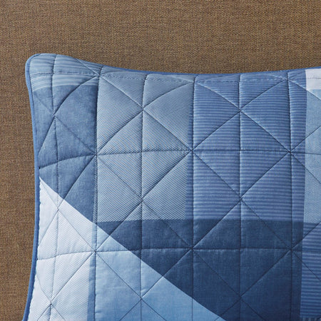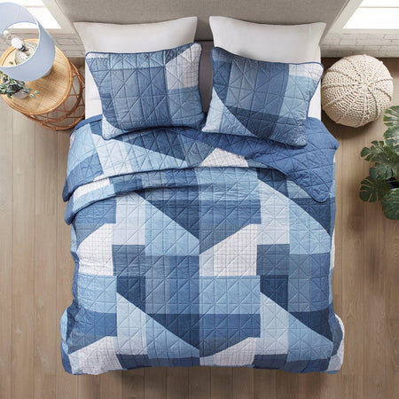 Bring a sharp, modern update to your bedroom with the Intelligent Design Skyler Patchwork Printed Reversible Coverlet Set. The coverlet features a geometric patchwork print in various shades of blue with a solid blue reverse, for 2 unique looks. Pre-washed fabric with cotton filling add softness and comfort, while matching shams (1 in Twin/TwinXL) complete the contemporary design of the quilted coverlet. Machine washable for easy care, this printed reversible coverlet set has an antimicrobial treatment that provides built-in freshness protection, reduces growth of odor causing bacteria, and keeps the fabric newer, longer.