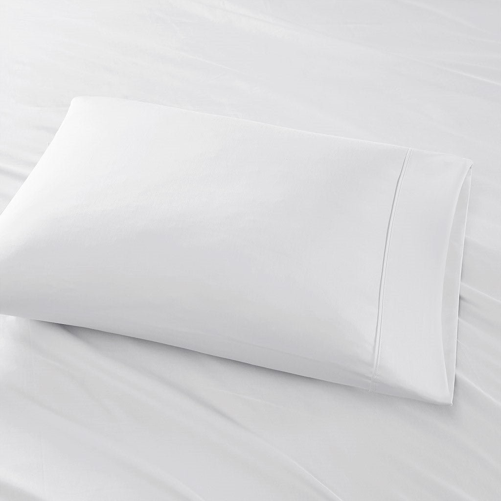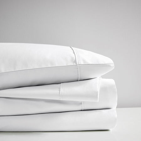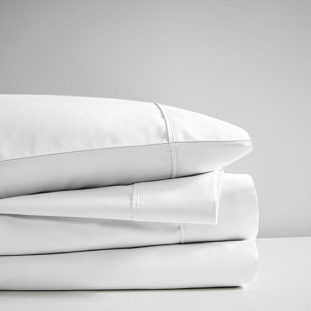 Sleep in the lush comfort of the Madison Park 525 Thread Count Cotton Blend Sheet Set. This solid sheet set is made from cotton blend sateen weave fabric with a 525 thread count. Our sheets go through a very light brushing process that gives them an incredible peach-like feel against your skin. If you've wanted to try cotton sateen sheets in the past, but have been put off by their crisp hand then these sheets are definitely for you. An included fitted sheet features a 1-inch snug grip elastic around the edge to securely stay on your mattress. These sheets are also OEKO-TEX certified, meaning they do not contain any harmful substances or chemicals, ensuring quality comfort and wellness. Super easy to wash. Ages well and becomes rumpled and relaxed after every wash, while ensuring a deep sleep each night. Set includes: 1 Fitted Sheet, 1 Flat Sheet, and 2 Pillowcases.