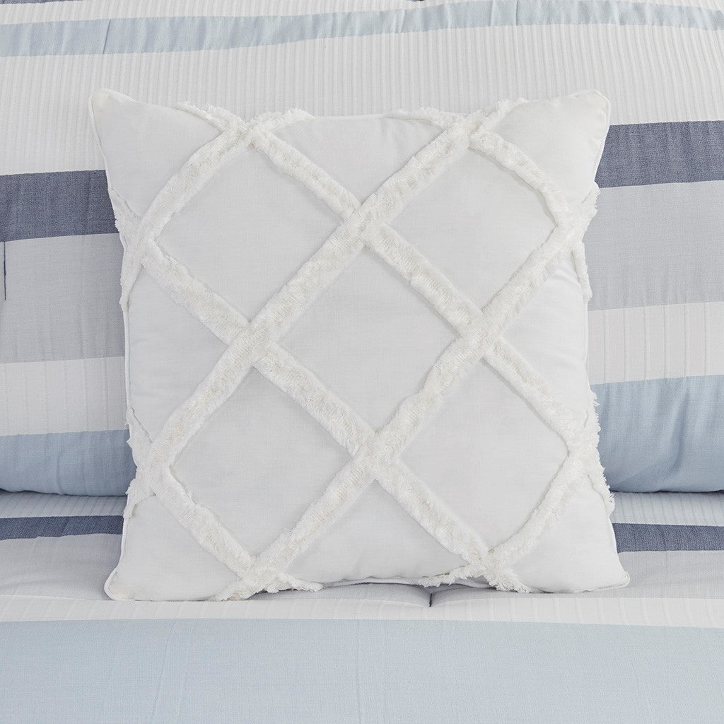 Refresh your bedroom with the casual charm of Madison Park's Allegany 5 Piece Jacquard Comforter Set. The jacquard comforter features a striped design, in blue, gray, and cream hues with a solid dark blue reverse, for an updated casual look. The matching shams pair handsomely with the farmhouse-inspired comforter, while an oblong and a square decorative pillow add textural elements to the comforter set. Hypoallergenic polyester filling in the comforter and pillows provides exceptional warmth and comfort all through the night. Machine washable for easy care, this jacquard comforter set has an antimicrobial treatment that provides built-in freshness protection, inhibits growth of odor causing bacteria, and keeps the fabric newer, longer. Bedding may come in rolled or compressed packing and will need to be fluffed up. Use a steam iron to help remove wrinkles easier.